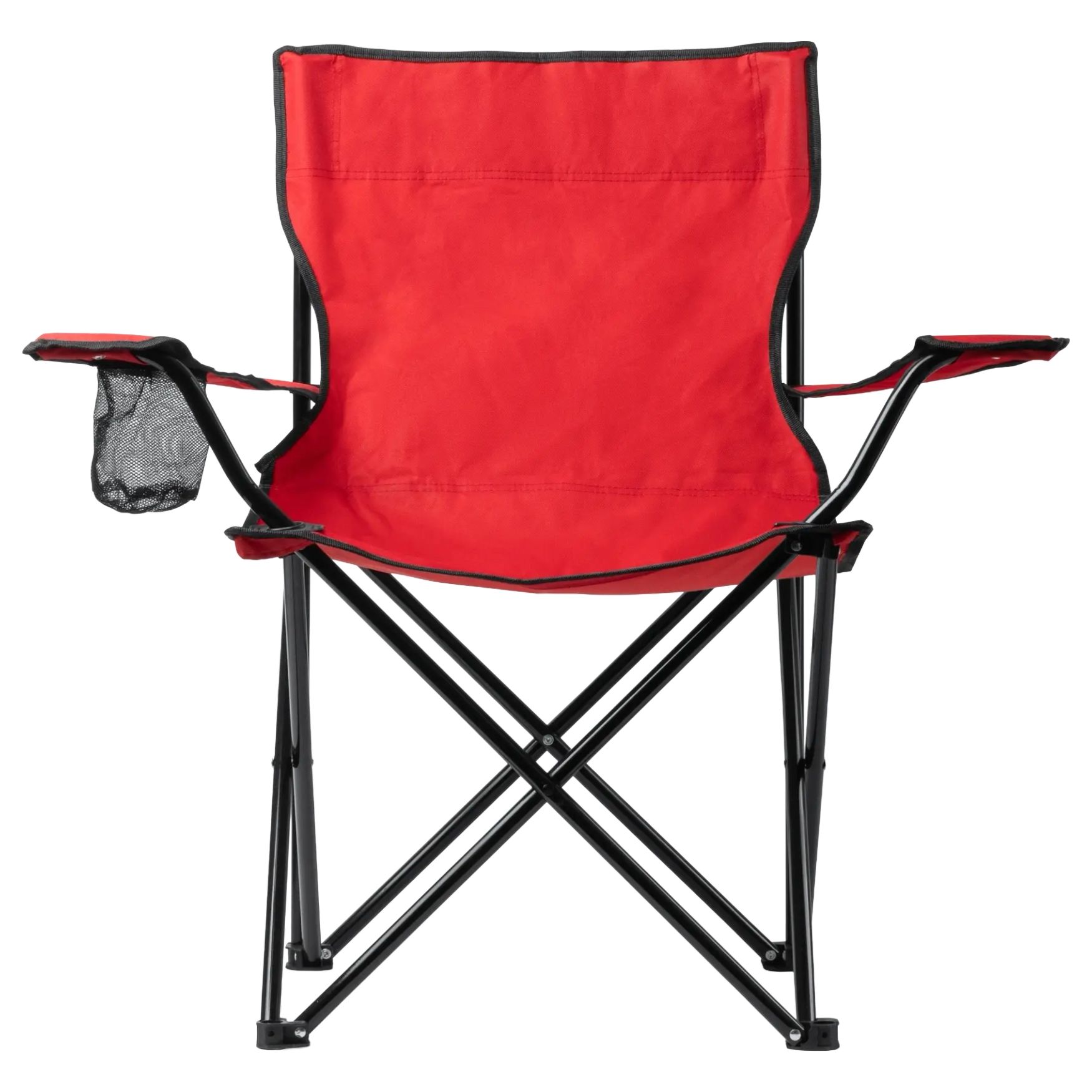 A cadeira dobrável BEKAL é projetada para uso externo com estrutura em poliéster 600 D. Possui apoios de braço com suporte para bebidas e estojo de transporte combinando.