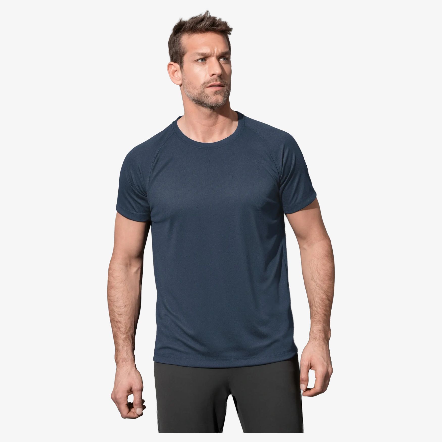 Camisa esportiva corte generoso para homens com mangas raglan em malha funcional de secagem rápida e respirável. Com faixa de limpeza contrastante e costuras planas excelente controle da umidade, mangas raglan, tecido leve e elástico, sem etiqueta de marca no pescoço.