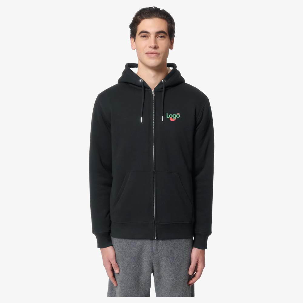 Moletom com capuz unissex forrado de sherpa com zíper. Mangas montadas. Capuz forrado de sherpa reciclado. Cordão de ajuste redondo na cor com ponta de metal. Olhais metálicos. Faixa de limpeza no interior do colarinho com padrão de ziguezague cinza/bege. Meia-lua no interior do colarinho no tecido principal. Zíper de metal coberto centrado na frente. Fim das mangas e fundo do corpo em costura elástica 1x1. Costura dupla nas axilas, fim das mangas e fundo do corpo. Bolso canivete na frente. Totalmente forrado de sherpa reciclado. Bolso interno no peito. Zíper interno invisível decorativo no fundo do corpo. Composição: 85% algodão orgânico fio e penteado, 15% poliéster reciclado. Este moletom é ideal para personalização por bordado ou impressão do seu logo, oferecendo maior visibilidade para sua marca.