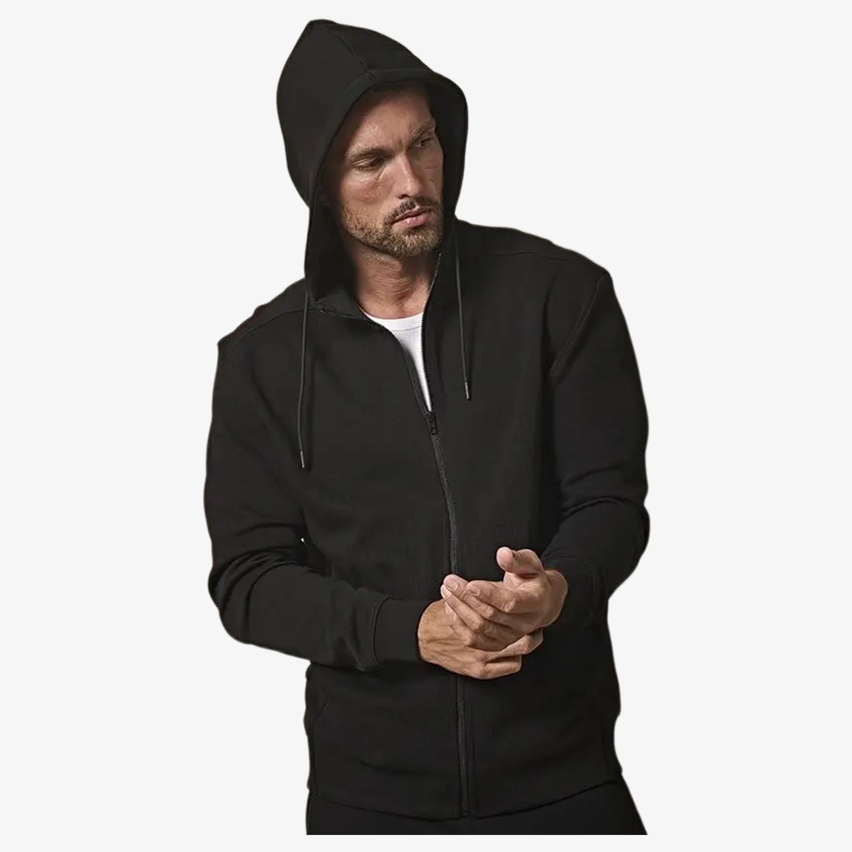 O Ribbed Hooded zip é um sweat com capuz com fecho concebido para uso diário. Inclui um capuz forrado com cordões, dois bolsos abertos na frente, acabamento canelado com elastano e fita de limpeza em espinha. O fecho de correr facilita a abertura e o ajuste conforme a utilização.