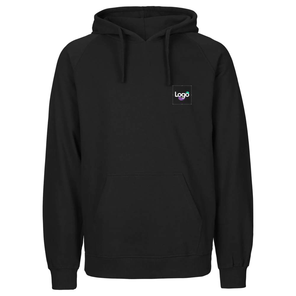 Moletom de capuz gros com bolsa kanguru na frente e capuz duplamente forrado com cordões planos ajustáveis. Faixa de limpeza no interior do colarinho, canelas duplas nas mangas e na cintura. Cordão plano. Sem etiqueta. Feito de algodão cardado e peinado 100% algodão biológico em conversão. Possibilidade de personalização em bordado para um resultado único e durável.