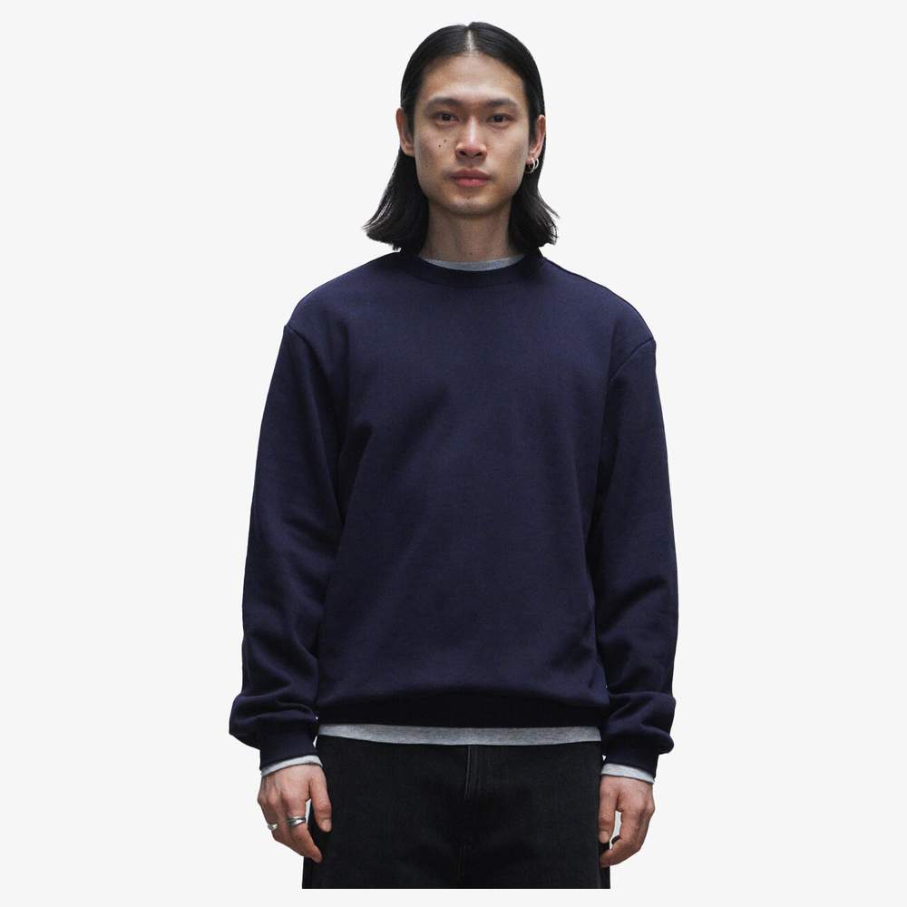 Este sweatshirt regular para homem é confeccionado em poliéster felpudo de peso médio, oferecendo um toque macio e um drapeado clássico. Ele apresenta uma costura de ombro rebatida em pontos de corrente com faixa de limpeza interna e um detalhe 'meia-lua' de duplo casaco no nível do colarinho. As costuras no nível do colarinho, da bainha e dos punhos completam esta peça de vestuário. Sua composição inclui 80% de algodão biológico e 20% de poliéster reciclado.