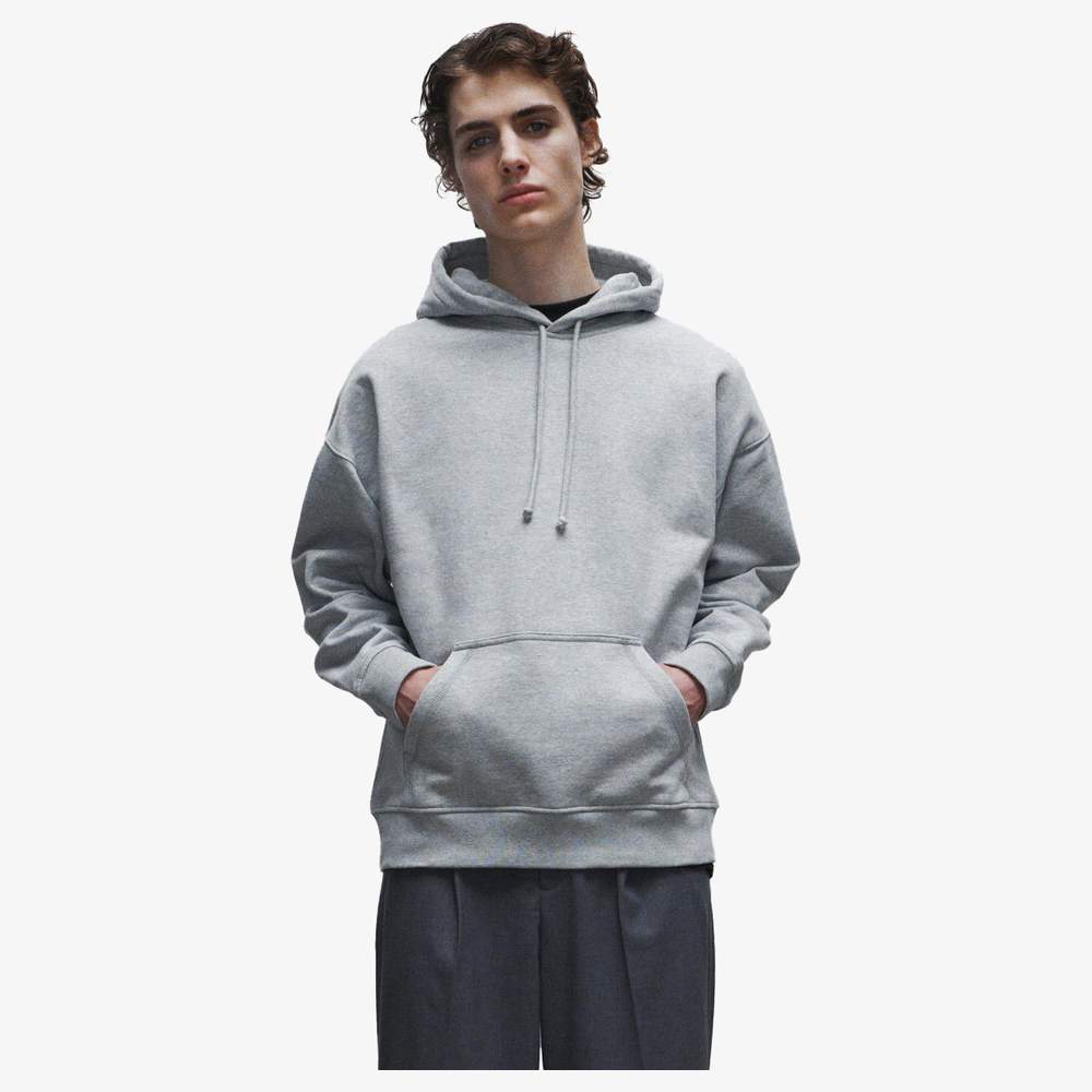 Moletom com capuz boxy para homem em poliéster felpudo grosso, fabricado a partir de 83% de algodão biológico e 17% de poliéster reciclado, com uma sensação de mão seca. Ele apresenta um corte quadrado e casual, com ombros caídos e costuras grossas e exageradas em toda a superfície, para uma estrutura melhorada. O moletom com capuz apresenta costuras rebatidas nos ombros, uma faixa de limpeza interna no pescoço e costuras de dupla agulha que envolvem todas as suas costuras. Ele também possui um capuz de dupla camada, com cordões de ajuste grossos e um detalhe interno no pescoço. O bolso kanguru tem uma costura plana, que também passa por trás do capuz para mais estrutura.