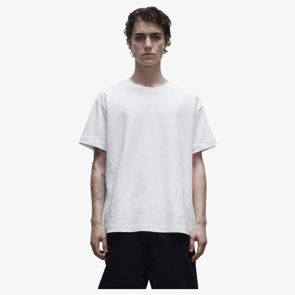 Esta camiseta boxy masculina é feita de malha simples 100% algodão orgânico, oferecendo um corte oversized e uma gola rente ao pescoço. Ela apresenta uma costura simples na abertura da manga e no nível da barra alongada. As costuras dos ombros são dobradas com fita de pescoço e uma costura simples em corrente. Uma faixa de limpeza está presente no pescoço.