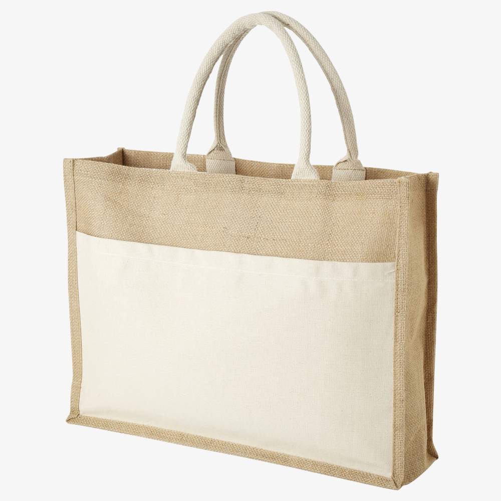 Esta sacola é fabricada a partir de uma combinação de algodão e juta de alta qualidade, tornando-a muito resistente. O grande compartimento principal de 18 litros é perfeito para transportar todos os essenciais do cotidiano. O bolso frontal fácil de acessar é ideal para guardar pequenos objetos. Uma sacola sólida e durável para transportar todos os itens.