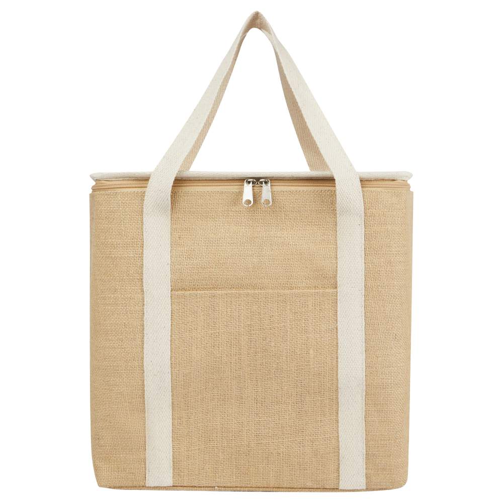 A sacola térmica Juta de 19 litros é projetada em juta laminada resistente. Oferece um grande compartimento principal capaz de acomodar até seis garrafas de 1,5 litro. O interior é revestido com isolamento de alumínio para manter as bebidas, alimentos e refrescos frescos e secos por um período prolongado. Esta sacola é equipada com um zíper superior, um bolso frontal prático e duas alças de transporte em algodão trançado de 50 x 2,5 cm. Suas dimensões são de 32 x 19 x 32 cm e sua composição é de juta.
