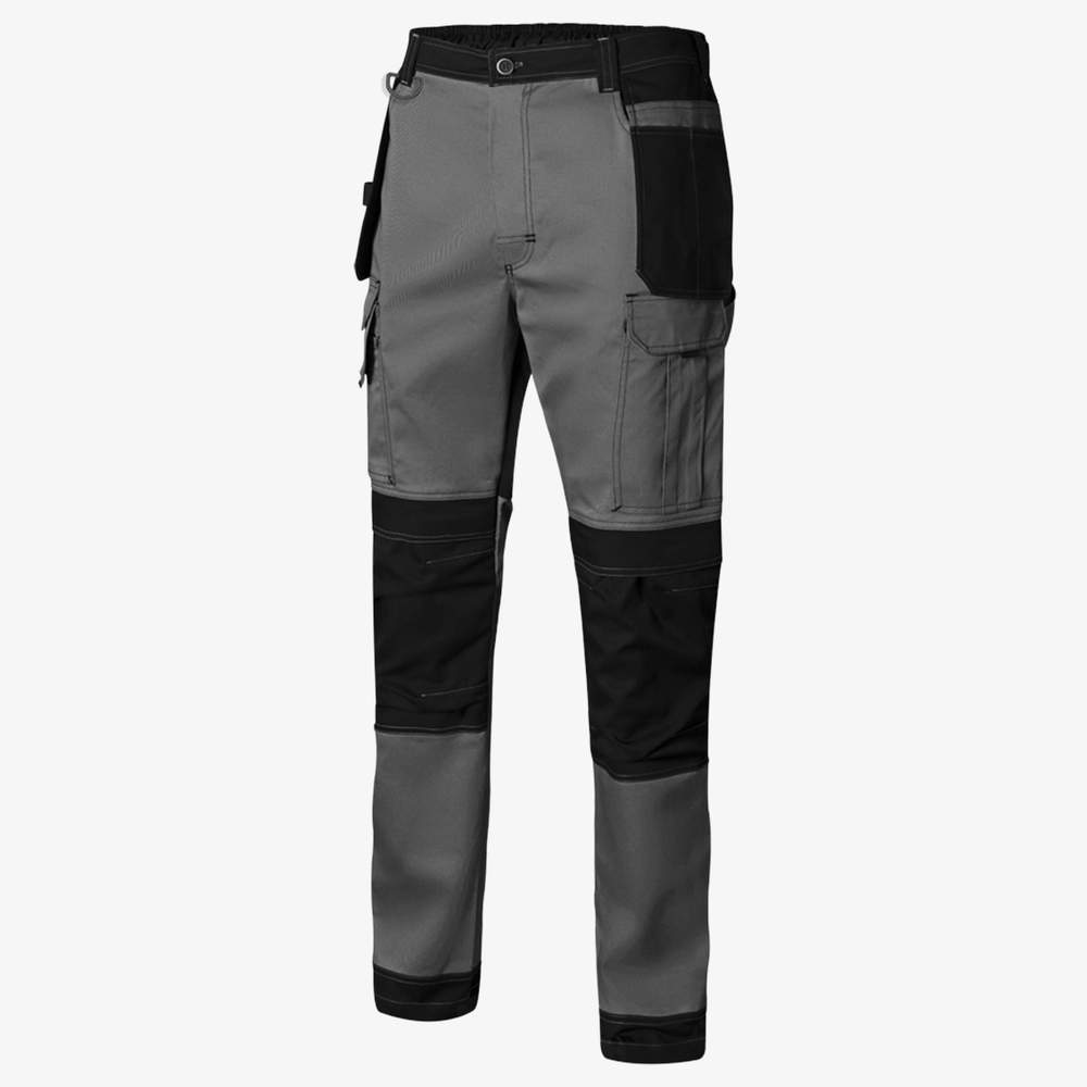 Calça de trabalho bicolor de lona stretch, projetada para oferecer conforto e resistência durante o uso profissional. Possui fechamento com botão e zíper e cinto elástico para um ajuste ótimo. Reforços em tecido oxford estão presentes nos joelhos e na parte inferior da calça para maior durabilidade. Um reforço em tecido também é integrado na parte traseira da calça. Possui bolsos para joelheiras, com fechamento por velcro. Costuras duplas de segurança reforçam a construção da calça. Pregas nos joelhos oferecem maior liberdade de movimento. Um anel de plástico é fixado em um dos passantes do cinto para facilitar a fixação de acessórios. A calça possui passantes para cinto. Possui bolsos flutuantes com diversos compartimentos para armazenamento organizado. Oferece um total de 10 bolsos