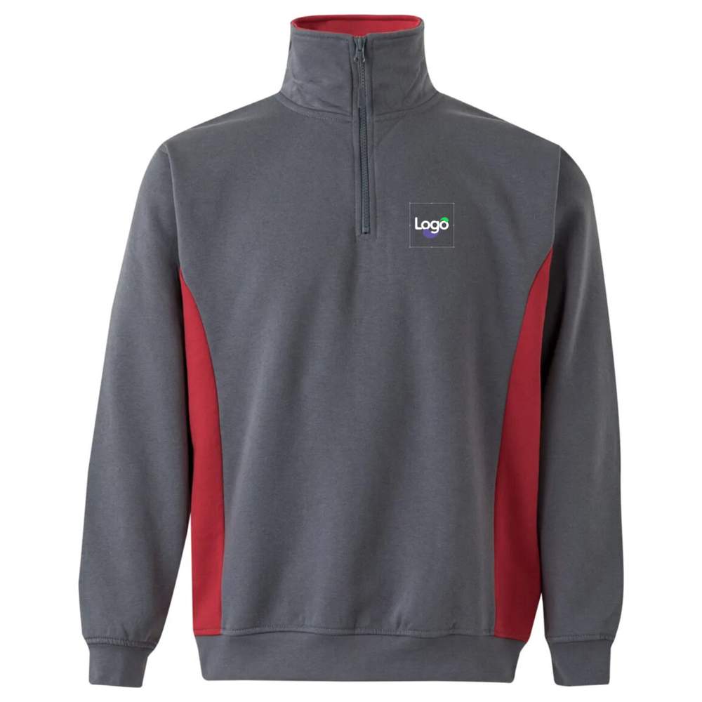 Sweat bicolor com zíper em molleton de algodão poliéster. Colar alto com zíper 1/3 com interior contrastado. Lados e punhos em borda coste para um conforto ótimo. Tratamento antibolhas para uma durabilidade aumentada. Este sweat é ideal para uma personalização em bordado, permitindo adicionar seu logotipo ou seu visual.