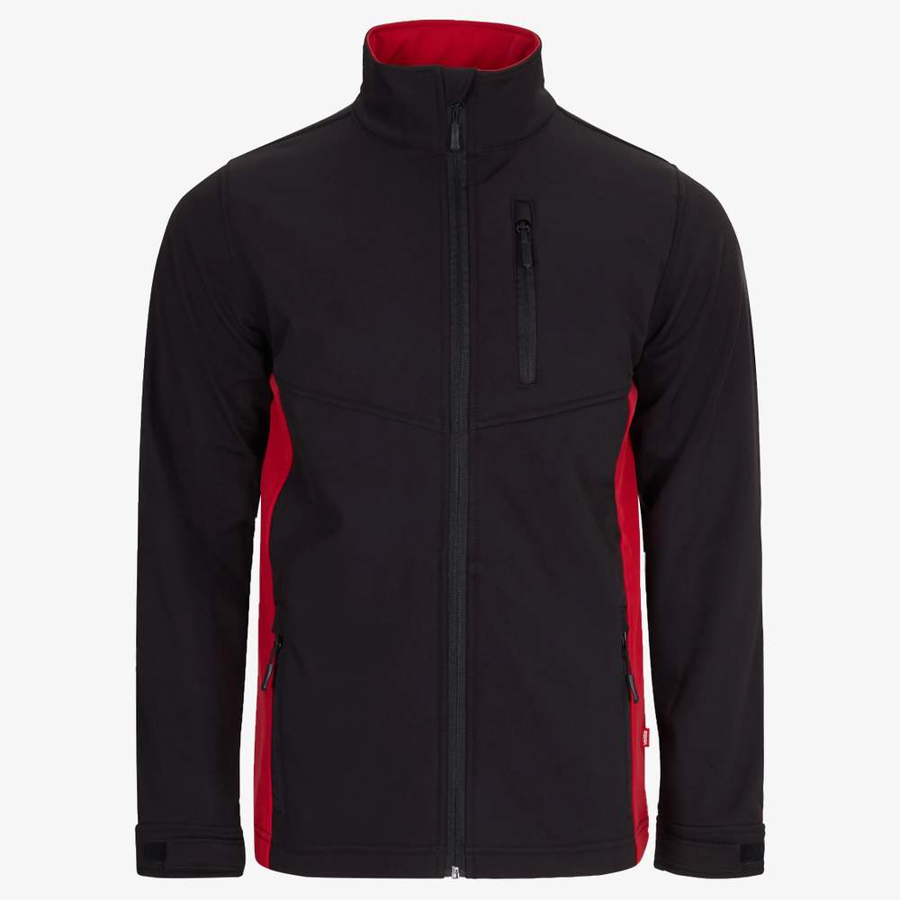 Jaqueta Softshell Bicolor. Este modelo de três camadas combina funcionalidade e conforto. Os lados e o interior do colar são contrastantes para uma estética distintiva. Uma aba de botão interior disfarça o zíper. Aplicações no peito e nas costas com costuras decorativas melhoram o ajuste. Os punhos são ajustáveis com fita autoagarrante para um suporte ótimo. A jaqueta possui cinco bolsos: três bolsos com abas e fechaduras de zíper invertidas e dois bolsos internos para armazenamento.