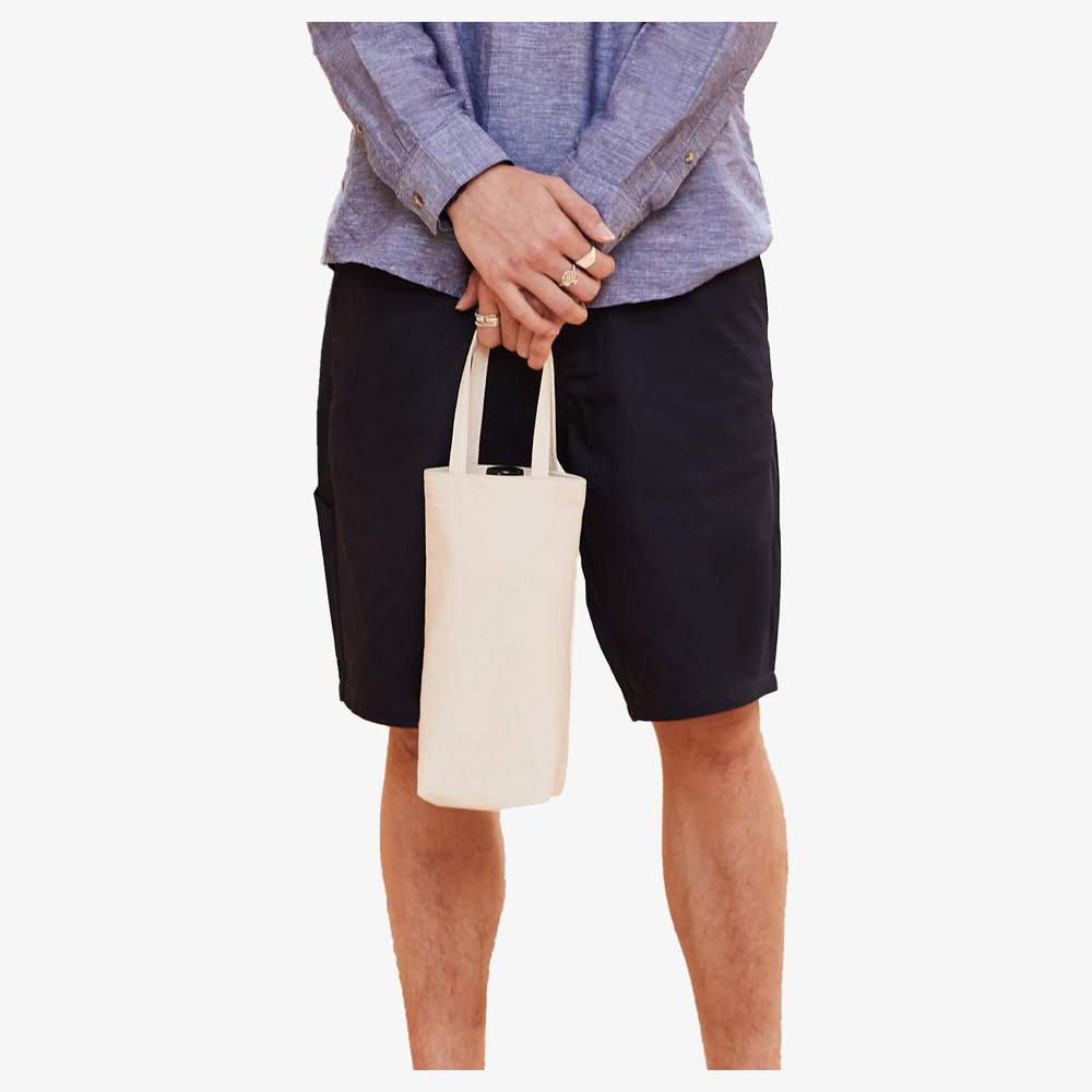 Saco concebido para transportar garrafas até 1,5 litro. As suas dimensões são de 8 x 27 x 8 cm, oferecendo uma capacidade de 2 litros. Este saco é fabricado a partir de 100% pano de algodão, proveniente do comércio justo. Não possui etiqueta.