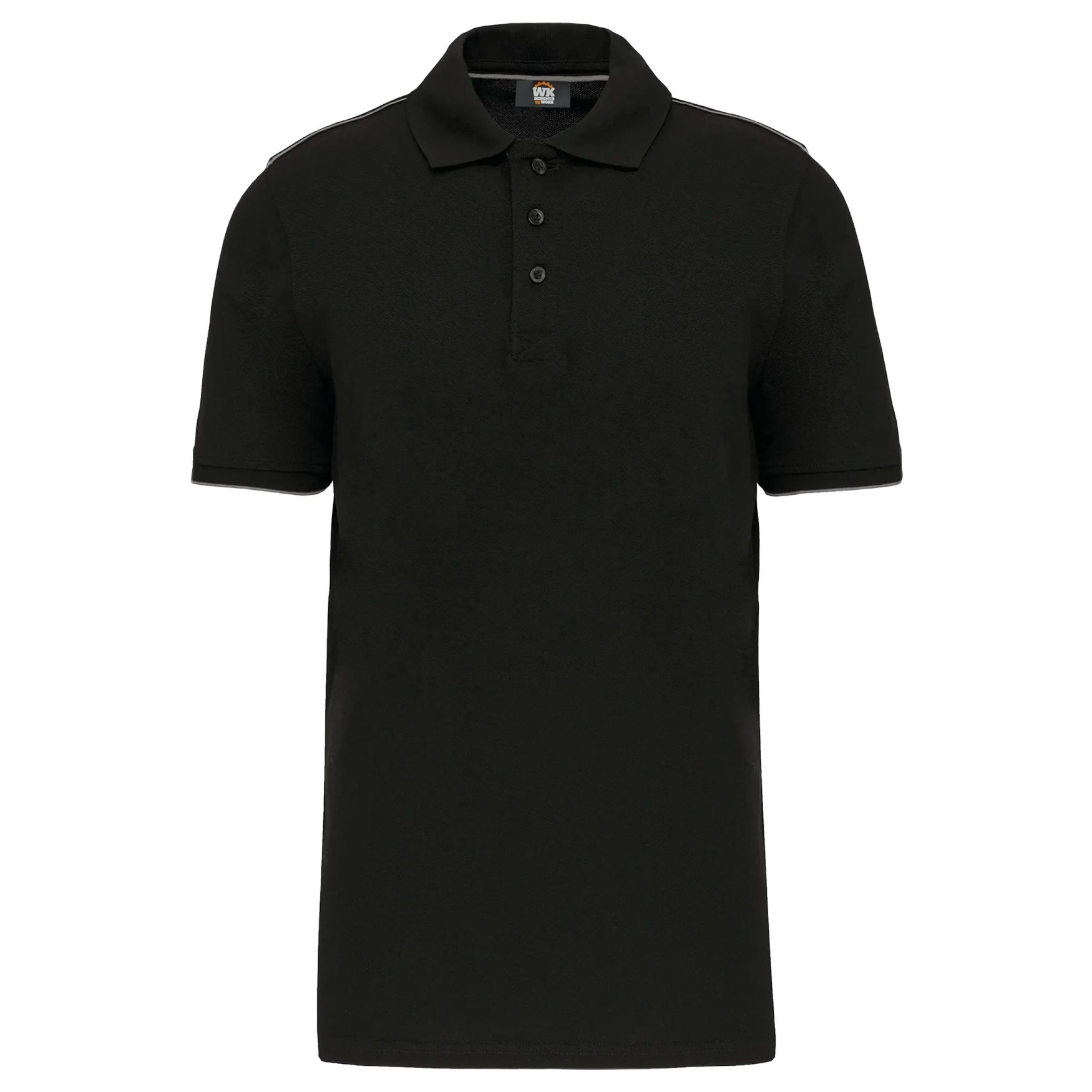 Polo contrastado com mangas curtas para homem. Abotoadura de 3 botões com banda interior contrastada. Colarinho em borda costeira com banda de propreté. Passepoil contrastado no colarinho e nos ombros. Acabamentos borda costeira com liseré contrastado na parte inferior das mangas. Fendas laterais com banda de chevron contrastada para mais conforto. Acabamento em dupla agulha na base da vestimenta. Composição 65% poliéster, 35% algodão penteado malha picada.