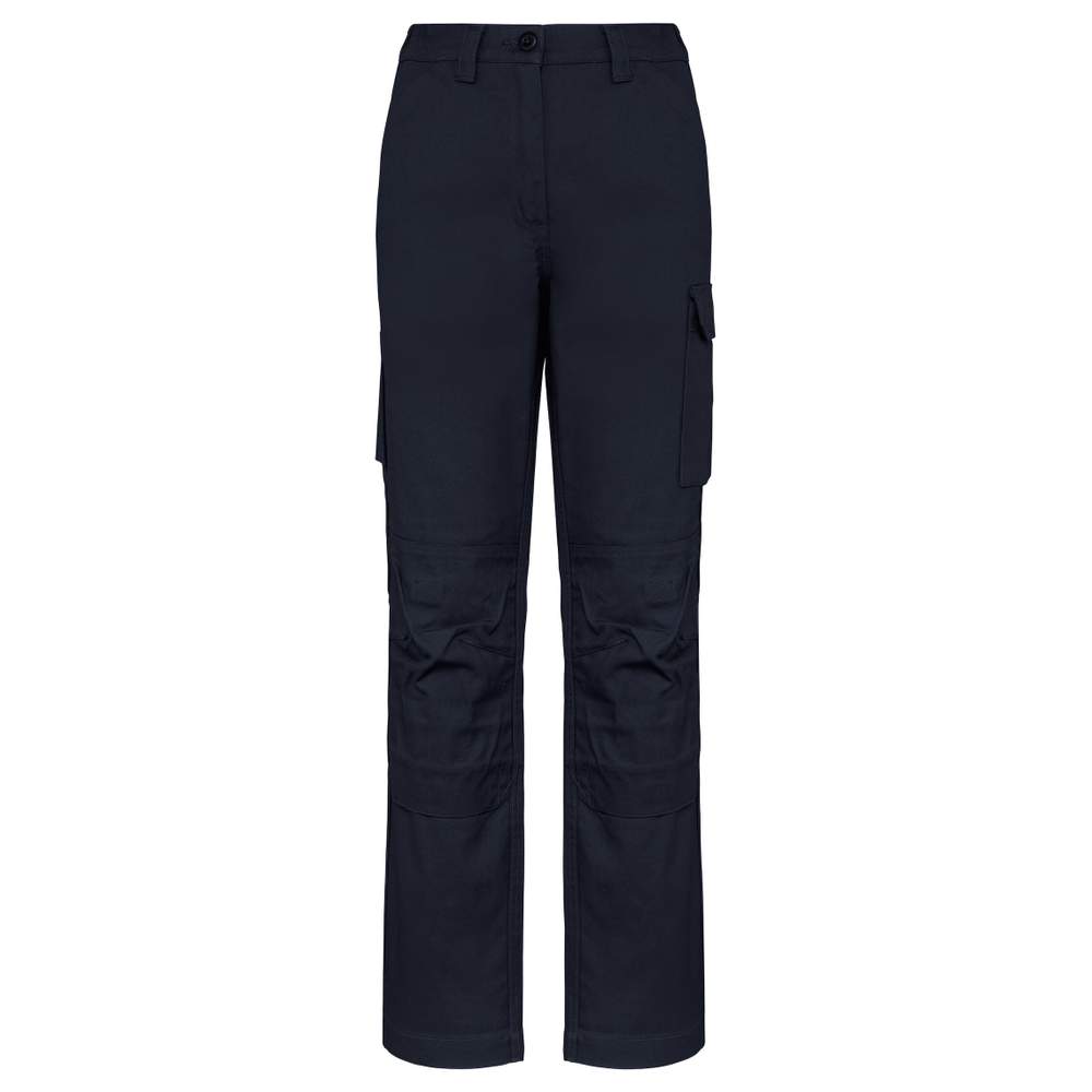 Calça de trabalho multi-bolsos para mulher. Projetado em tecido sarja, esta calça oferece grande resistência e conforto ótimo. Seu corte reto e seu cinto parcialmente elástico com passantes garantem um ajuste confortável. Possui 2 bolsos frontais, 1 bolso com aba e fecho por velcro, 1 duplo bolso de ferramentas, 2 bolsos traseiros e 2 joelheiras com velcro e aba interna. O zíper fechado e o botão plástico garantem um fechamento seguro. A aba na entreperna oferece maior liberdade de movimento e a costura dupla nas laterais, a costura tripla na aba e no forro reforçam a durabilidade da calça.