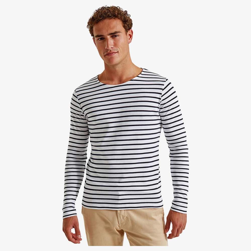 Långärmad mariniärströja för män. Denna modell har en klassisk passform och en rund halsring. Axelbanden och bottenkanten är utförda med dubbel nålsöm för en vårdad finish. Tyg är mjukt att ta på, vilket ger optimal komfort. Denna tröja är designad för daglig användning och passar olika klädstilar.