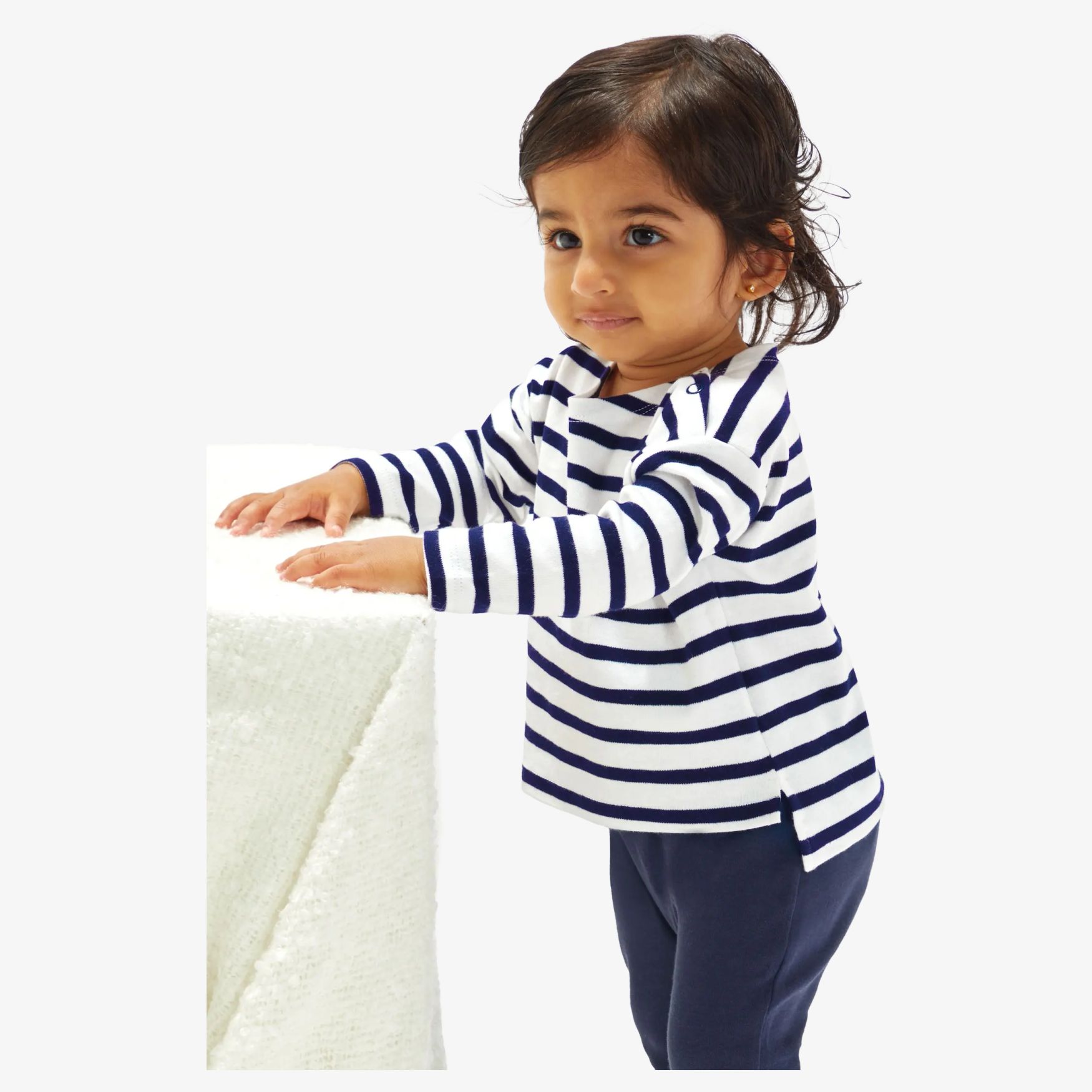 Baby breton top baby-tee-shirt med sjömansmönster med horisontella ränder på 8 mm, tryckknappar utan nickel på axeln och sidosprund för att underlätta påklädning och rörelse.