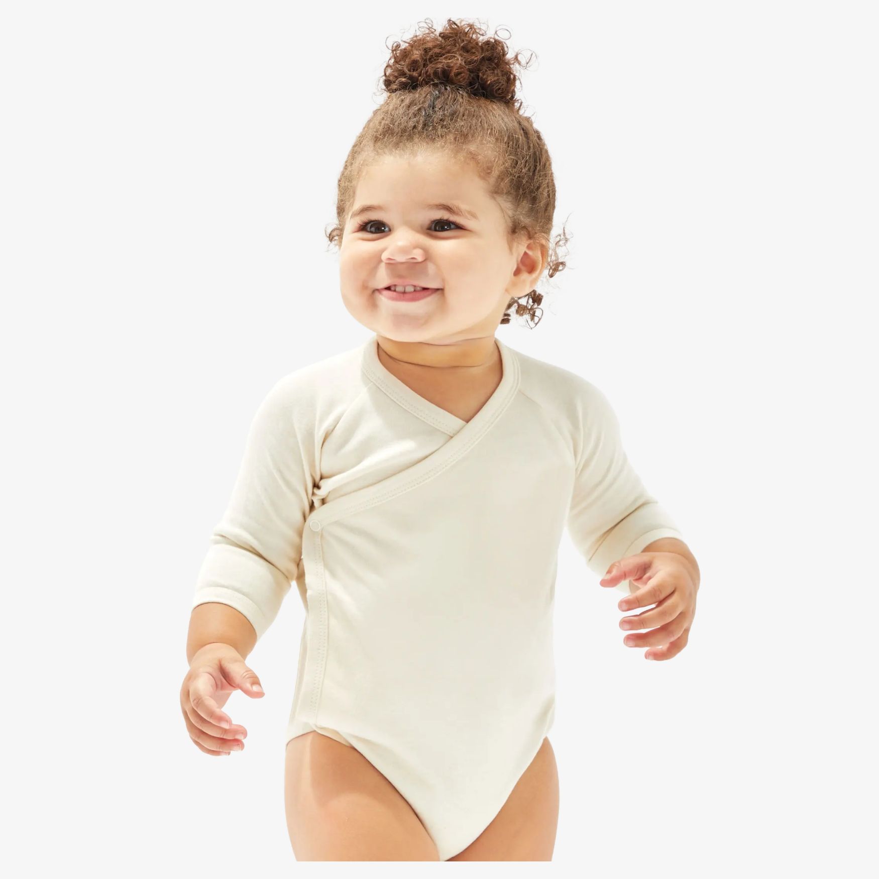 Baby kimono-body är en baby kimono-body med långa raglanärmar, med öppning i grenen med nickel fria tryckknappar, för att underlätta påklädning och blöjbyte.