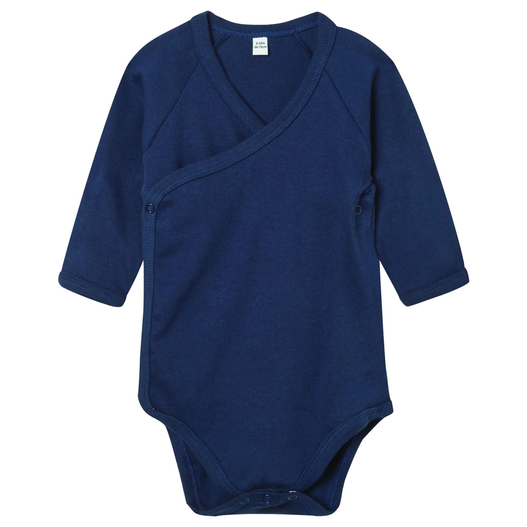 Baby kimono-body är en baby kimono-body med långa raglanärmar, med öppning i grenen med nickel fria tryckknappar, för att underlätta påklädning och blöjbyte.