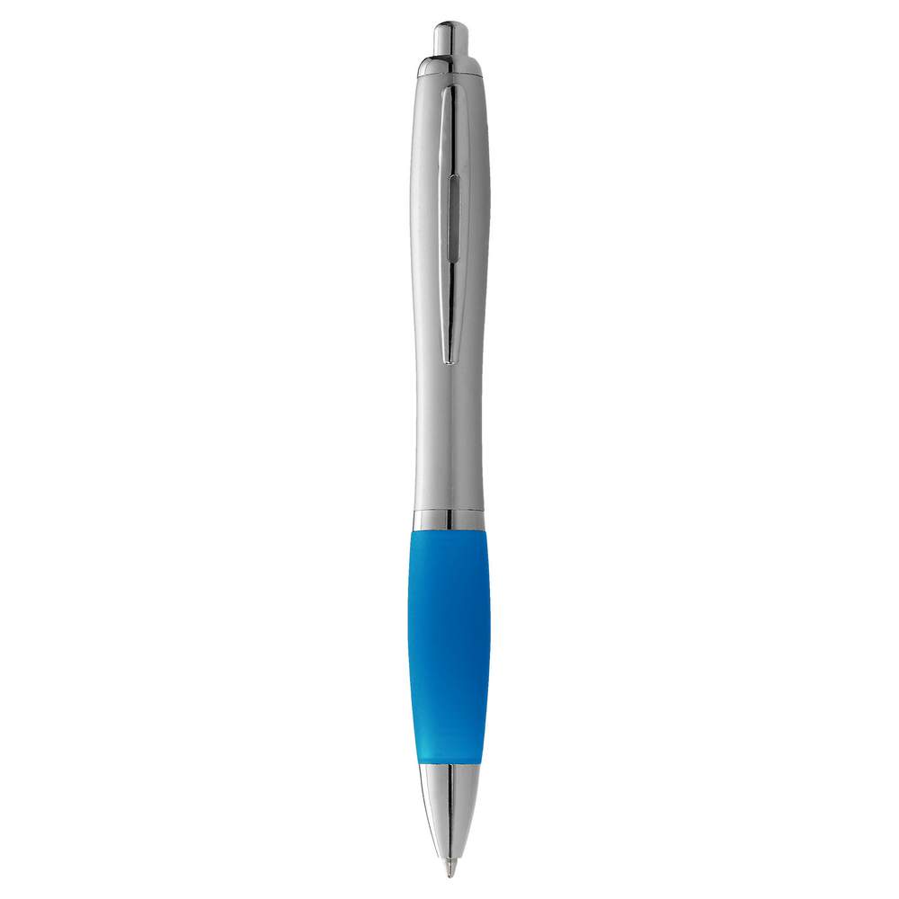 Kulspets med silverfärgad kropp och färgglad grip, utrustad med knapptryckmekanism. Tillverkad i plast ABS, erbjuder denna kulspets god motståndskraft och bekväm handtag. Den är fylld med svart bläck för en flytande och varaktig skrivning. Dess mått är 14 x Ø 1,3 cm. Denna kulspets är ett idealiskt stöd för din företagskommunikation eller för att ge ett personligt present. Det är möjligt att anpassa denna kulspets med ditt logotyp, ett meddelande eller ett unikt design, för att stärka ditt varumärke eller skapa en originell present.