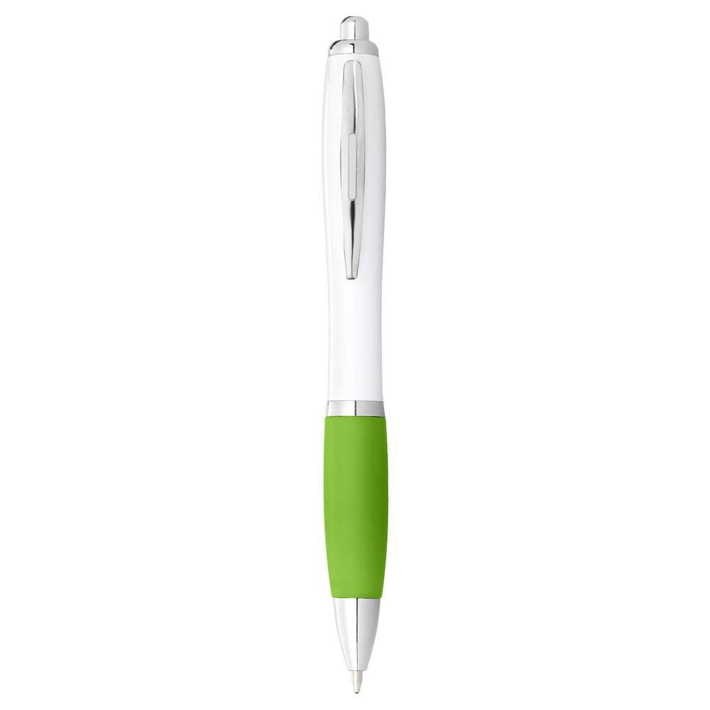 Penn med vit kropp och färgad greppyta, utrustad med en knapp. Tillverkad av plast ABS är denna penn idealisk för dagligt bruk. Den är utrustad med svart bläck för skriftflöde och läsbarhet. Dess mått är 14 x Ø 1,3 cm. Pennan är personligbar, vilket gör den till ett utmärkt stöd för att främja din varumärke eller företag.