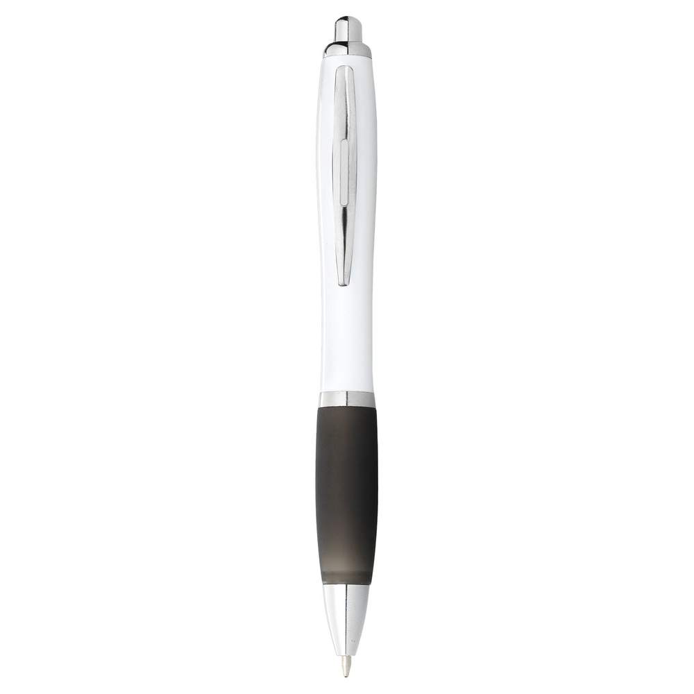 Penn med vit kropp och färgad greppyta, utrustad med en knapp. Tillverkad av plast ABS är denna penn idealisk för dagligt bruk. Den är utrustad med svart bläck för skriftflöde och läsbarhet. Dess mått är 14 x Ø 1,3 cm. Pennan är personligbar, vilket gör den till ett utmärkt stöd för att främja din varumärke eller företag.