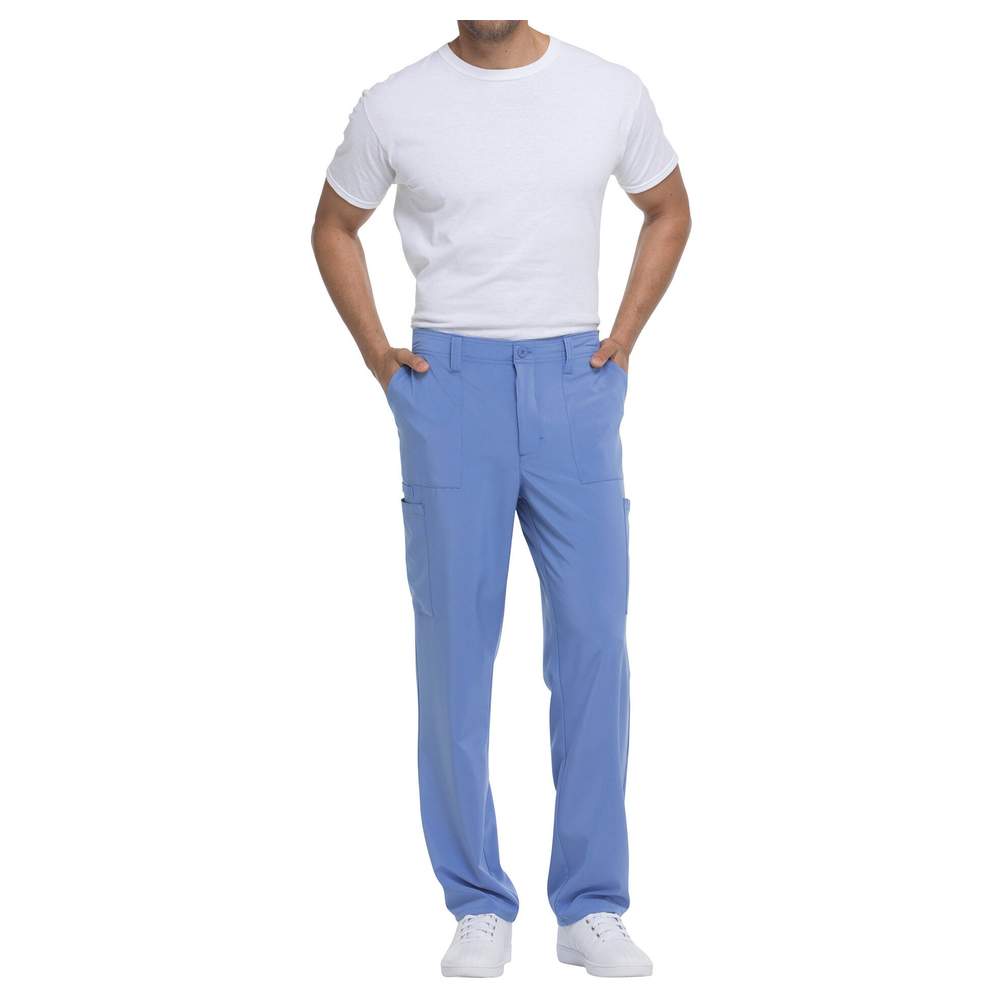 Arbetsbyxor för män, maskulin skärning. Elastiskt bälte på baksidan med inre dragkord. Dragkedja med knäppning. Fem bälteöglor. Sex fickor: två framfickor, två cargofickor, två baksäckar. Arbetsbar band med verktygslås.