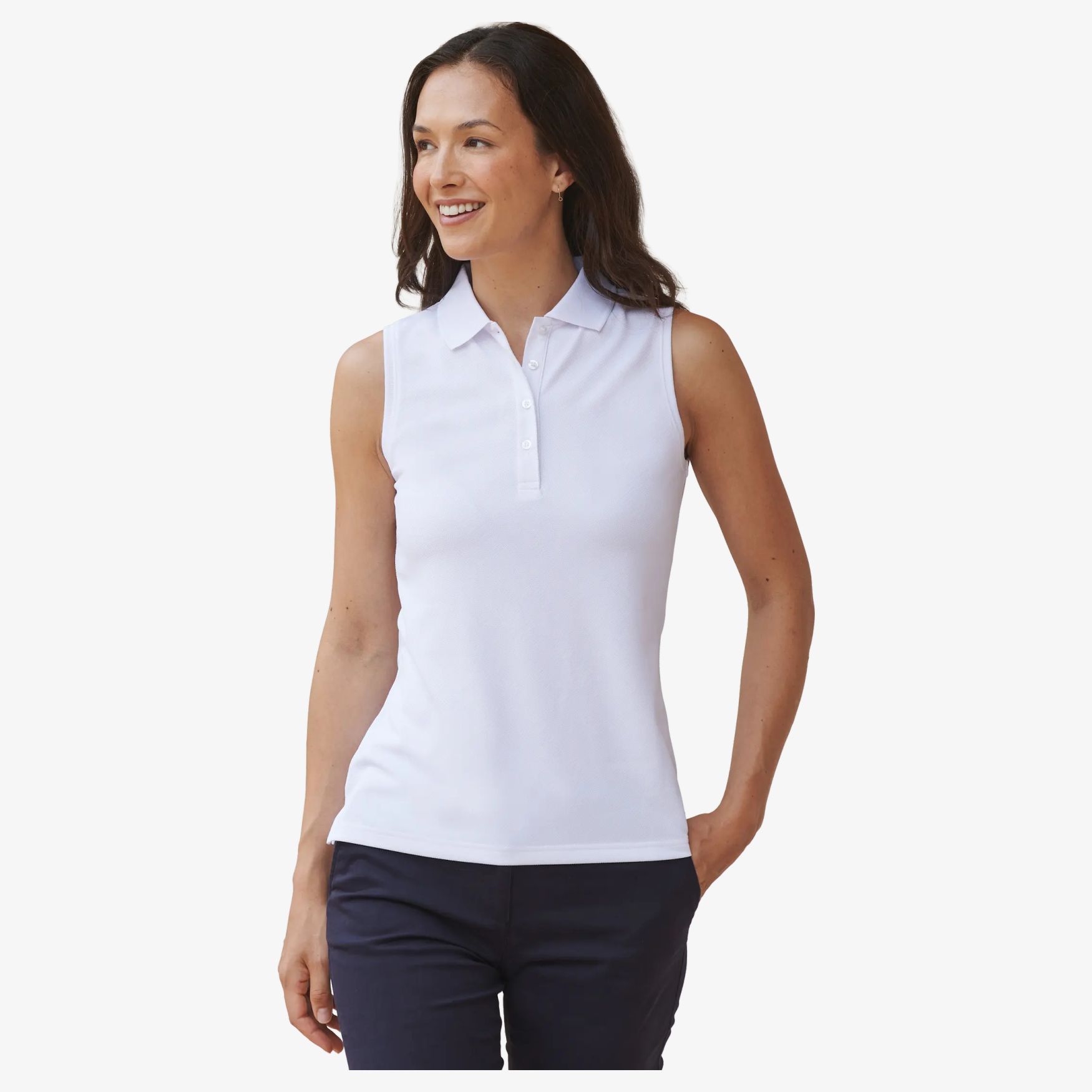 Damens ärmlös polo använder andningsbar Coolplus®-teknologi. Den har en smal knappslå med fyra knappar, ribbade kanter vid krage och ärmhål samt sidöppningar.