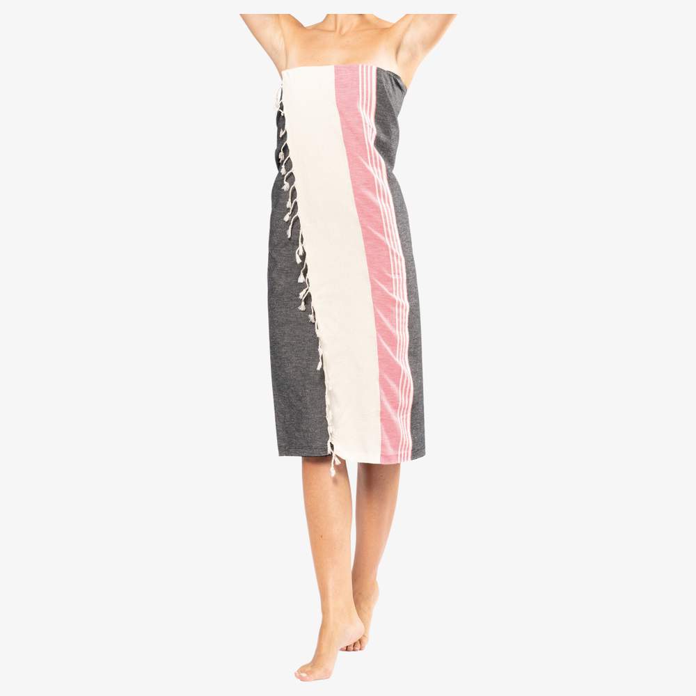Denna randiga fota är tillverkad av 100% bomull, vilket ger en mjuk och trevlig textur. Dess mått på 170 cm x 90 cm gör den till ett mångsidigt tillbehör, användbart som strandhandduk, pareo eller lätt filt. De tvinade fransarna med en knut lägger till en original touch till denna artikel. En specialbehandling ger produkten ett avsiktligt åldrat utseende, vilket skapar unika färgvariationer för varje stycke.