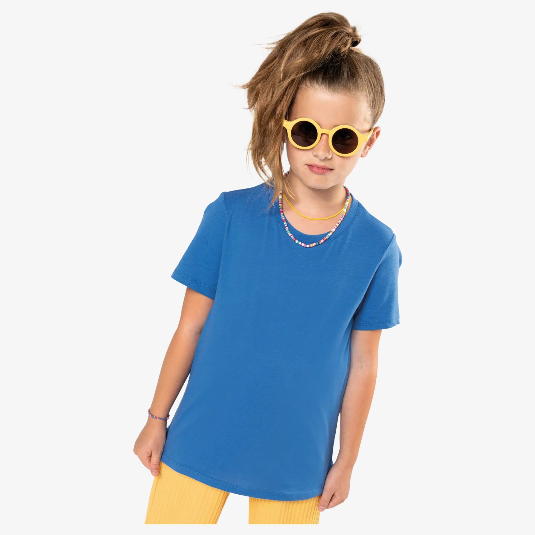Bio t-shirt för barn. Sydd skärning. Rond hals med bord-côte och elastan. Propretsband ton i ton vid halsen. Dobbla nålsbotten på ärmar och botten av klädet. Certifierad STANDARD 100 by OEKO-TEX® N° CQ1007/7, IFTH.