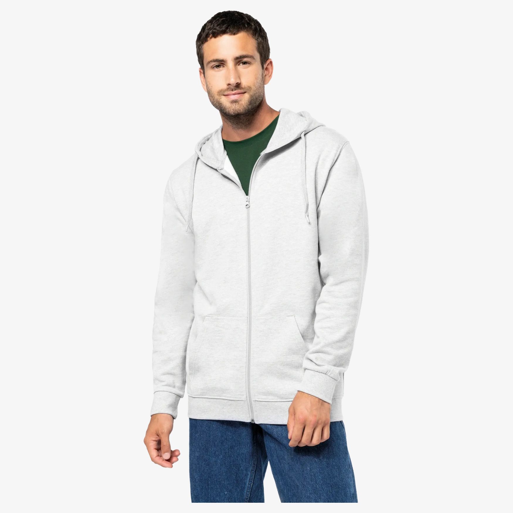 Återvunnen huvtröja med dragkedja, unisex, i borstad sweatkvalitet, rak passform och skuren och sydd konstruktion. Känguruficka, huva med polybomullsfoder och invändig nacktejp i kragen.