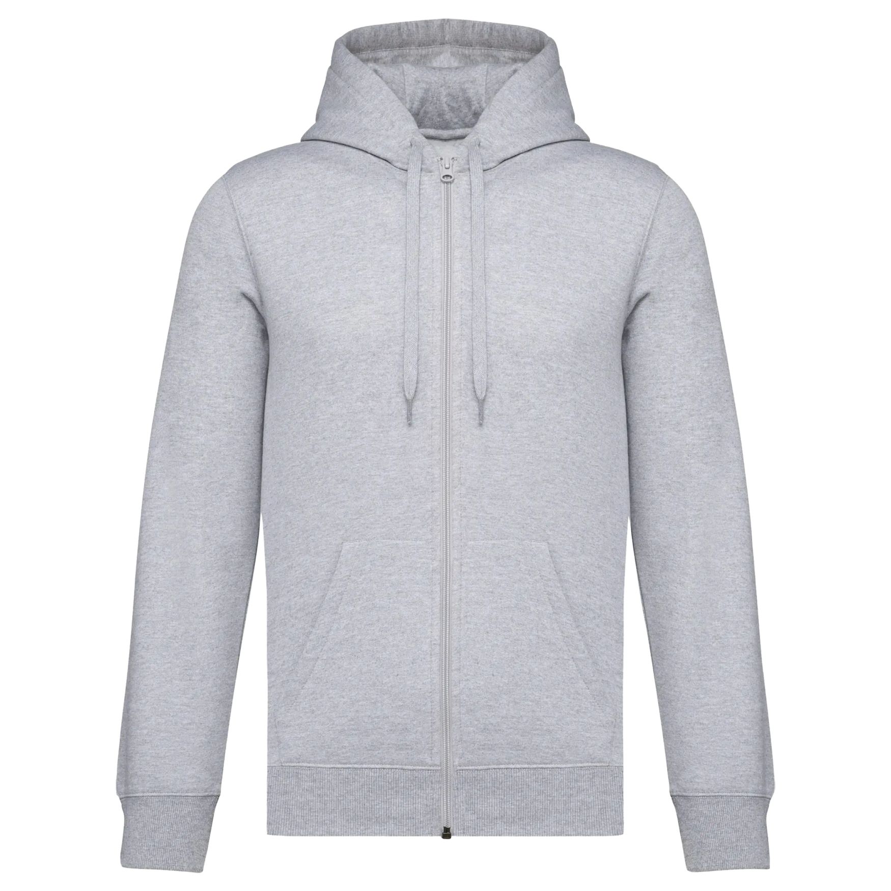 Unisex sweatshirt med dragkedja och huva, tillverkad i borstad fleece med rak passform och skuren-sydd konstruktion. Den har 2x1 ribbstickad kant med tubulär söm i krage, ärmslut och nederkant för en ren finish samt en känguruficka. Dragkedjan är i nylon. Huvan är fodrad med polybomullsjersy och har platt snöre. En ton-i-ton jersykantning finns på insidan av kragen. Märkesetiketten är borttagen för att underlätta anpassning med en storlekschip.