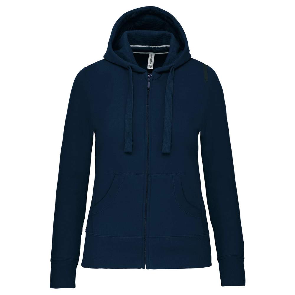Drakt med dragkedja och huva för dam, tillverkad av 80% kamgarn och 20% polyester. Den borstade ytan ger optimal komfort. Det har ett kontrasterande renhetband runt halsen och en dublerad huva. Dess fickor är praktiska, medan de dragkantsladdade ärmar och nederkant på klädet säkerställer bekvämt passform. YKK-dragkedjan garanterar ett tillförlitligt och hållbart stängning.