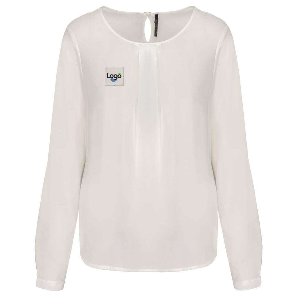 Krageblus långärmad kvinna tillverkad i 100% polyester. Dess krusiga och lätta material ger optimal komfort. Den har en rund halsring med bias och små veck vid framsidan av halsen. Stängningen sker bak och vid botten av ärmarna med en knapp som är täckt. Denna modell är personlighetsanpassad och tillåter läggning av ditt logo eller annat visuellt material för effektiv kommunikation. Möjlighet till personlighet genom broderi.