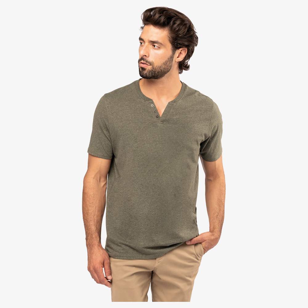 Ekologisk t-shirt med korta ärmar för män. Rät block. Sidor syner. Krag med enradig kant och öppningsflik med 3 metallknappar. Inre renhetsband på kragen i huvudmaterial. Dubbel nål botten på ärmar och botten på klädesplagg. Certifierat STANDARD 100 by OEKO-TEX® N° CQ1007/7, IFTH. Sammansättning: 80% biologisk bomull, 20% återvunnet polyester post-consumer. Denna t-shirt är idealisk för personliggöring med ditt logga eller visuell.