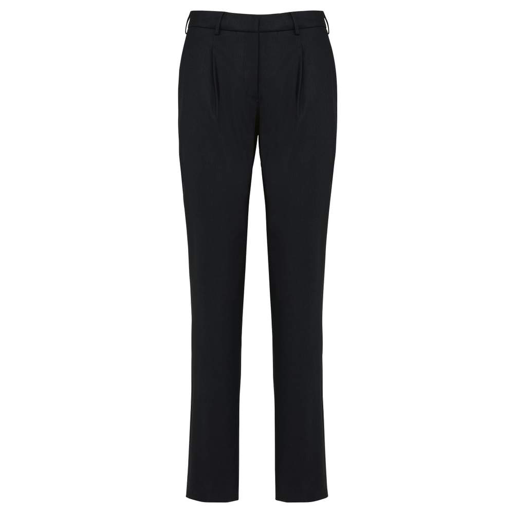 Elegant dambyxa, passform. Ton i ton fodral 100% polyester. Två sidfickor och två baksidfickor med kantband. Fickpåse i polyester twill. Zipplås med metallknapp och skyddat av ett tygband som hålls på plats av en knapp. Bältepassare vid midjan. Rensningsvinkel på insidan vid bältesfästet. Veck på framsidan av benet. Inga märkesetiketter, endast en storlekschip.