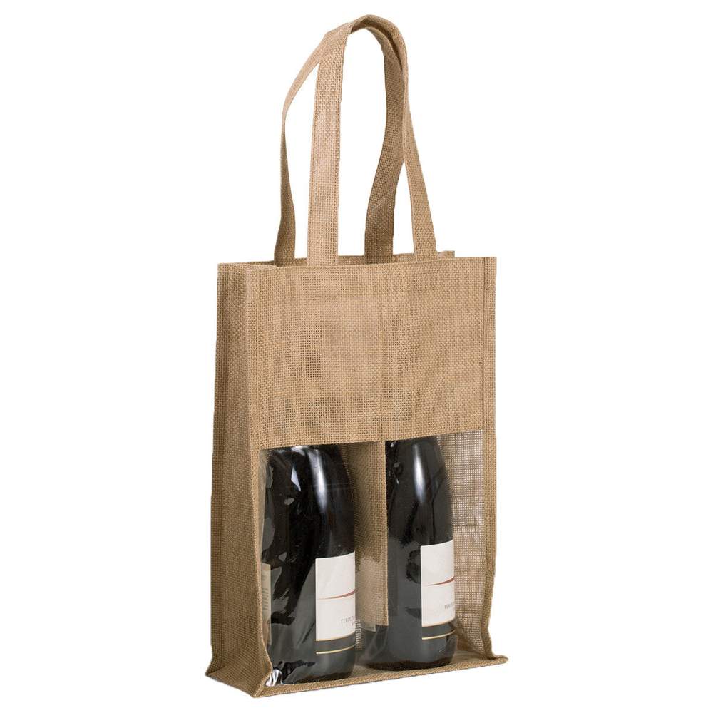 Flaskbärande väska i juteskinn, konstruerad för att transportera två flaskor. Den har två handtag för att underlätta transporten och ett genomskinligt fönster som gör det möjligt att se innehållet. Denna väska erbjuder en praktisk lösning för transport av flaskor vid olika evenemang eller aktiviteter. Måtten är 24x10x36 cm.