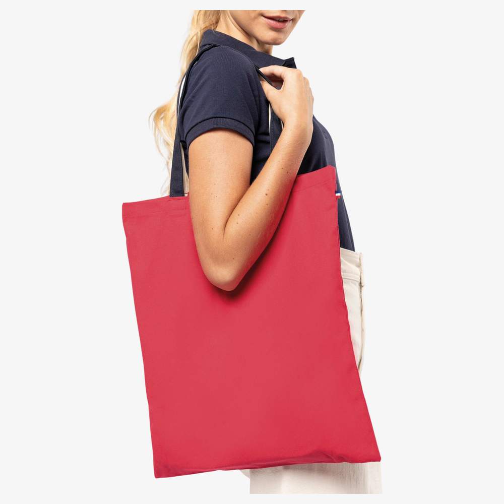 Denna köpsäck är sydd i bomullstyg. Den tillverkas i Frankrike och har "Origine France Garantie"-märkning. Den har en vävd etikett i de franska flaggans färger som är sys på sidan. De vävda handtagen är 2.5 cm breda och 50 cm långa, vilket ger en visuell kontrast. Dess dimensioner är 43 x 36 cm för en kapacitet på 13 liter.