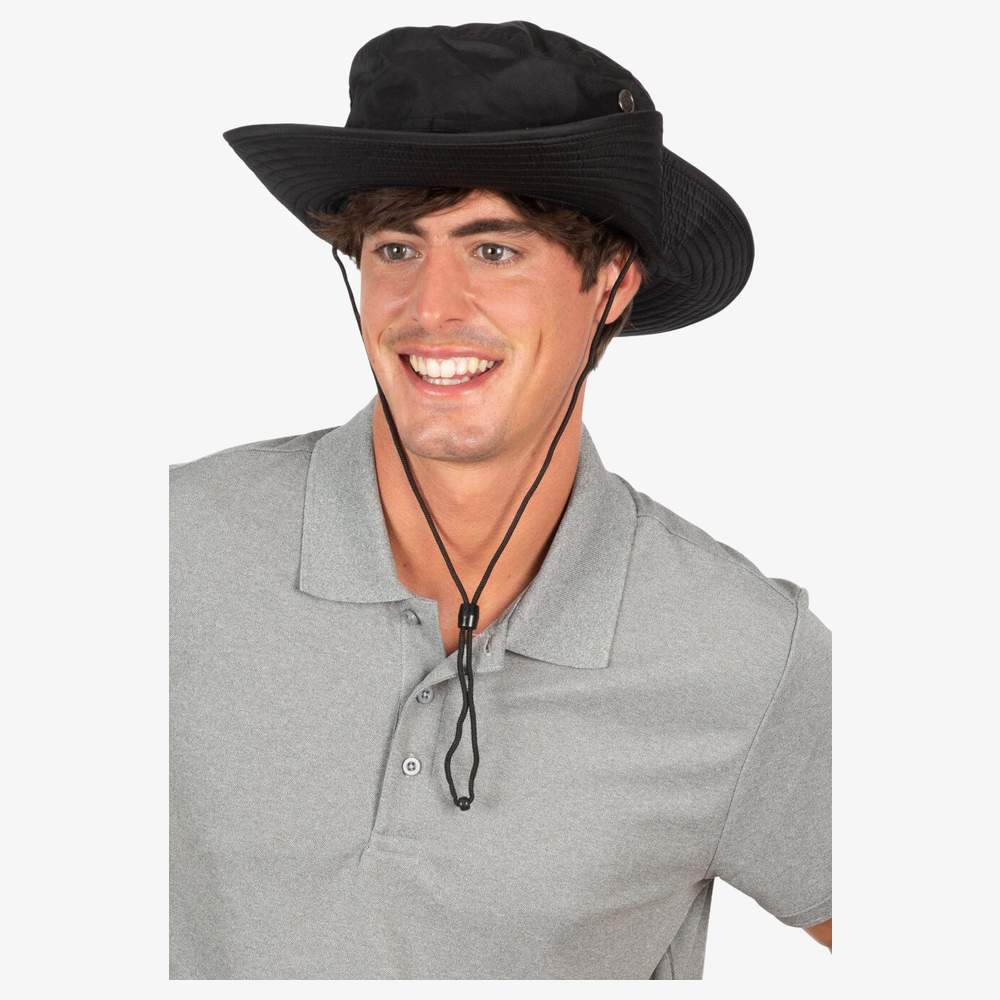 Denna hatt är tillverkad av 100% polyester med en beläggning för ökad hållbarhet. De huvudsakliga sömmarna är kontraförstärkta för att förbättra vattentätheten. Dess elliptiska form erbjuder effektivt solskydd, medan de breda mjuka och vikbara kanterna ger en bekväm passform. Tryckknappar på sidan gör det möjligt att ändra hattens form. Ventileringsöppningar främjar luftcirkulationen. Ett band med stoppare säkerställer optimal hållning. Denna hatt är tillgänglig i två storlekar.