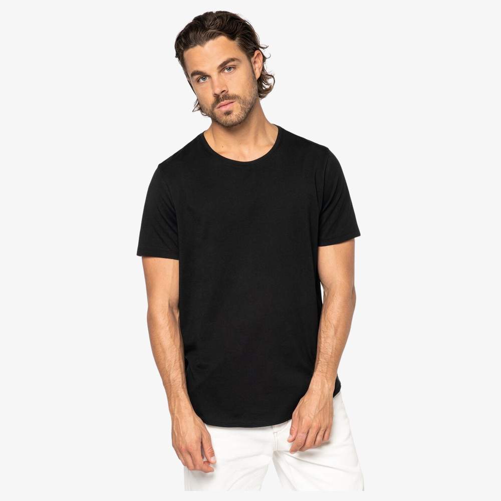 Rund botten t-shirt för män i kamgarnad ringspun bomull. Regular passform, sidor med sömmar. Enzymtvättat. Enkelhetsband inuti halsen och kant med enkel överstygn och kant med dubbel nål på botten av ärmar och klädesplagg. Runda botten på klädesplagget. Sammansättning: 100% biologisk bomull. Möjlighet att personalisera med ditt logotyp eller visuell.