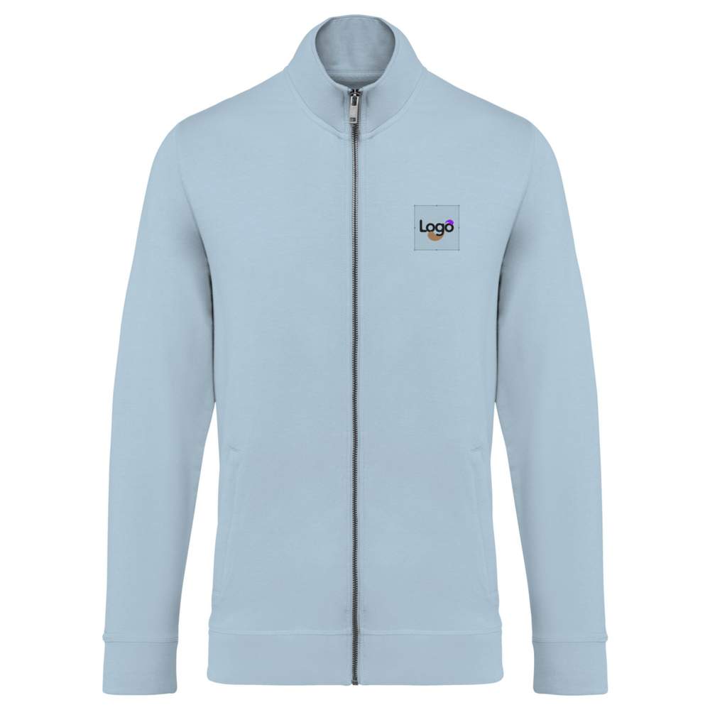 Herrmansjacka med uppslagskrage, smal passform, uppslagskrage. Ovanligt mjuk textur, halvmåne på baksidan. 2 framlompor, metallzipp i återvunnet material. Ärmkanter och nedre kant av kläder och fickor i huvudmaterial. Halslinning med renhetsskena inuti i huvudmaterial. Överlappningspunkt på armkanter, ärmhålor, kapuschong och nedre kant av kläder. Sammansättning: 48% modal TENCEL™, 47% ekologisk bomull, 5% elastan. TENCEL™ är ett varumärke av Lenzing AG. Möjlighet till personliggöring genom broderi för ett unikt utseende.
