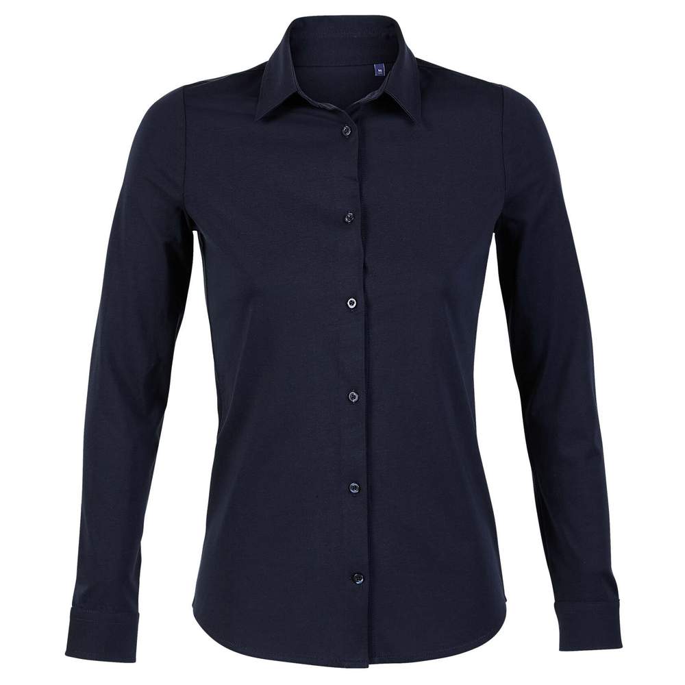 Kemisk i merceriserad jersey för kvinnor. Modellen har långa ärmar med en italiensk krage. Avrundade manschetter med två justerbara knappar och överdragsmanchett. Kemiken stängs med ett knäppsystem (överdrag med 7 knappar, matchande färg på textilen). Sammansättning 100% cotton