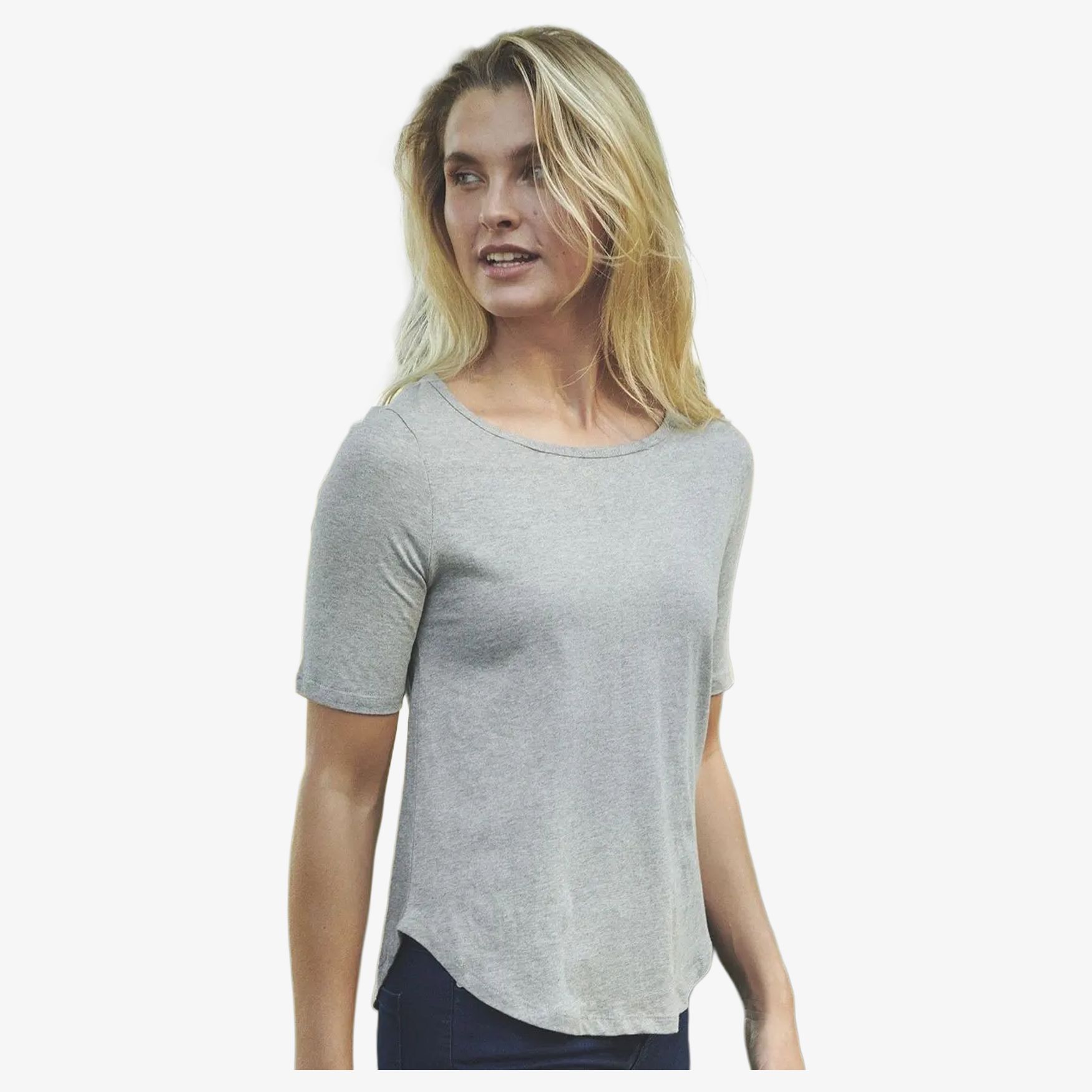 Dam tee-shirt är en tee-shirt med halvlånga ärmar, anpassad för daglig användning. Dess enkla skärning och ribbade krage ger en bekväm passform. Nackbandet i kragen ger en diskret invändig finish.