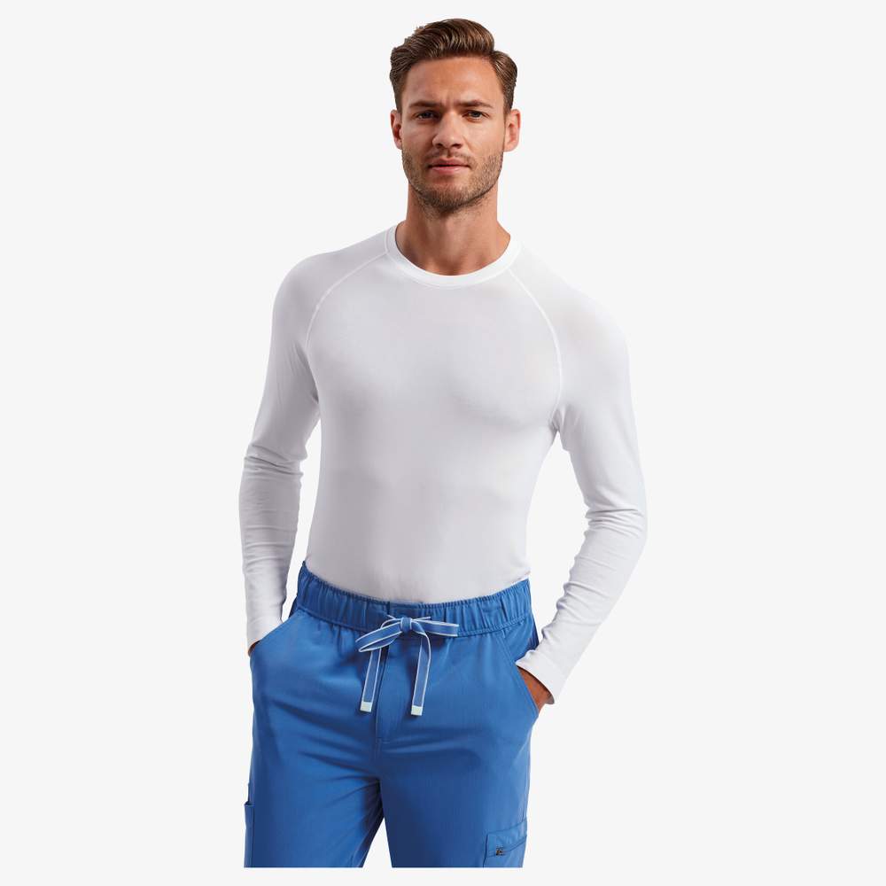 Underkläder till medicinsk uniform med långa ärmar för män. Komfortabelt fyrstreckbart tyg som tillåter stor rörlighet. Luftgenomsläppligt för optimal komfortkänsla, enkelt att sköta och krymprädd för förenklad daglig användning. Desodoriserande egenskaper för ökad hygien. Halslinning nära halsen och överaxlade ärmar syss för förbättrad komfort. Body utan sömmar med jakkardmönster för en mjuk känsla mot huden. Innehåller återvunnet nylon.
