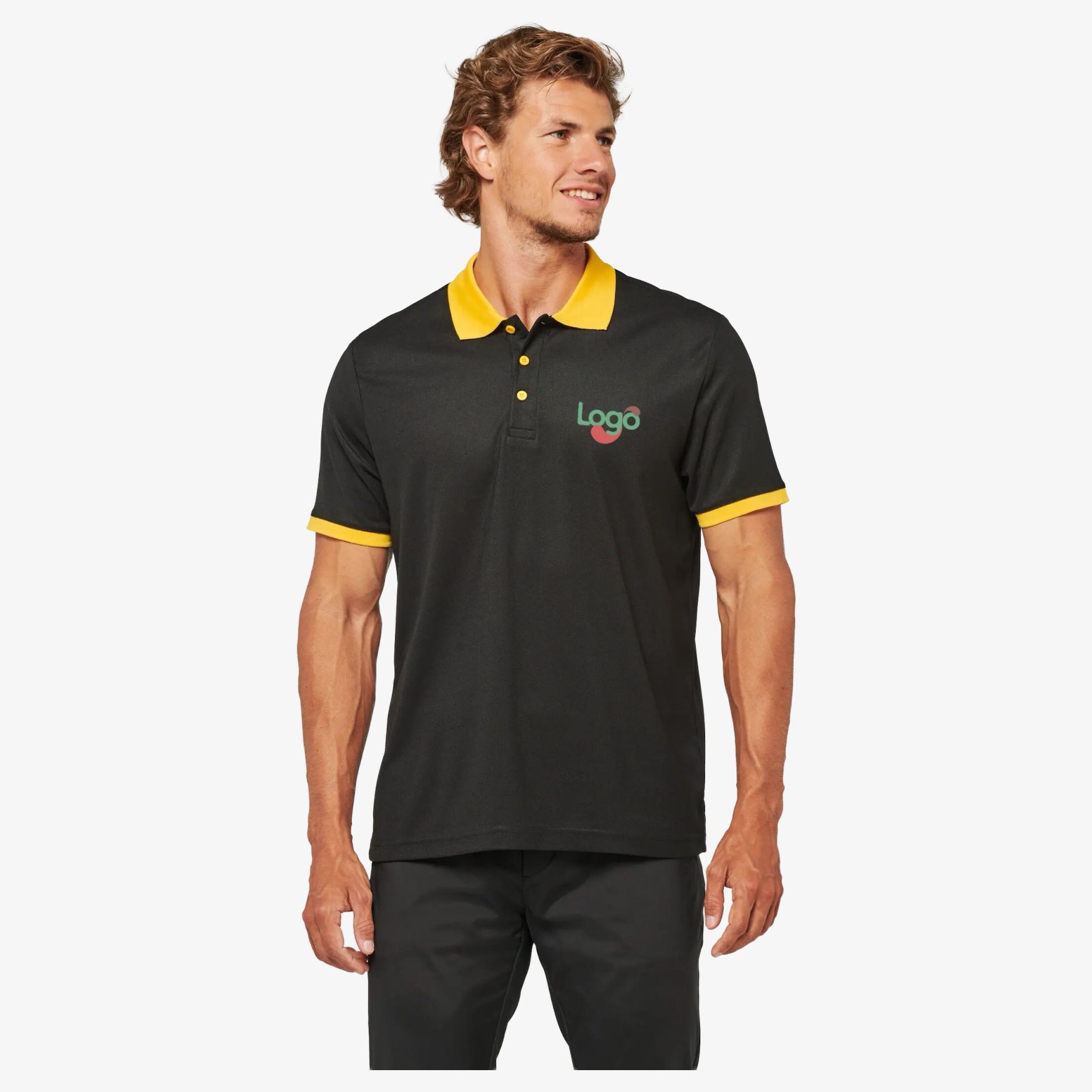 Denna prestandapolo för män är tillverkad av 100% polyester stickad tråd Cool Plus®, som erbjuder snabb torkning och optimal komfort. Dess passform och moderna utseende gör den idealisk för sportsaktiviteter eller professionella evenemang. Kragen och ärmkanterna med kontrastfärgad kantlinje tillför en touch av elegans. Den har en knapprad med 3 knappar i kontrastfärg och sidöppningar för ökad rörlighet. Denna polo är också anpassningsbar genom stickning, vilket gör det möjligt att lägga till ditt logotyp eller din visuella identitet för effektiv kommunikation.