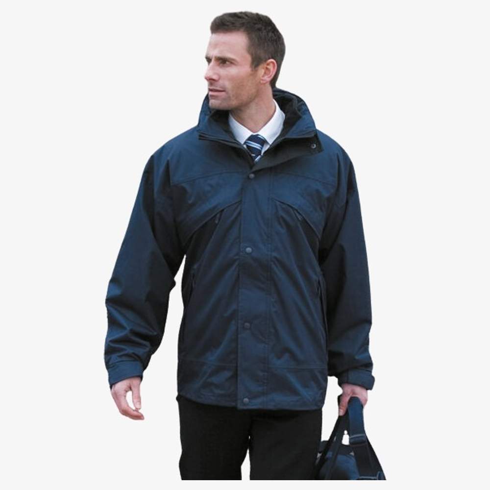 Denna 3-i-1 jacka kombinerar en vattentät ytterjacka med en avtagbar polär för ökad polyvalens. Ytterjackan är utrustad med svetsade sömmar för optimal skydd mot väder och vind. En full längd blänk låter dig öppna jackan uppifrån eller nedifrån, och ett vindskydd med knäppfästen erbjuder extra skydd. Fyra frampåsar med blänk och regnskärmar ger säkert förvaringsutrymme. Den integrerade huva i kraven kan justeras med hjälp av ett klämmbälte. Ett elastiskt dragband i basen låter dig justera jackan för optimal komfort. Tillgång till vänster bröst och i ryggfodret underlättar tryckning och broderi.