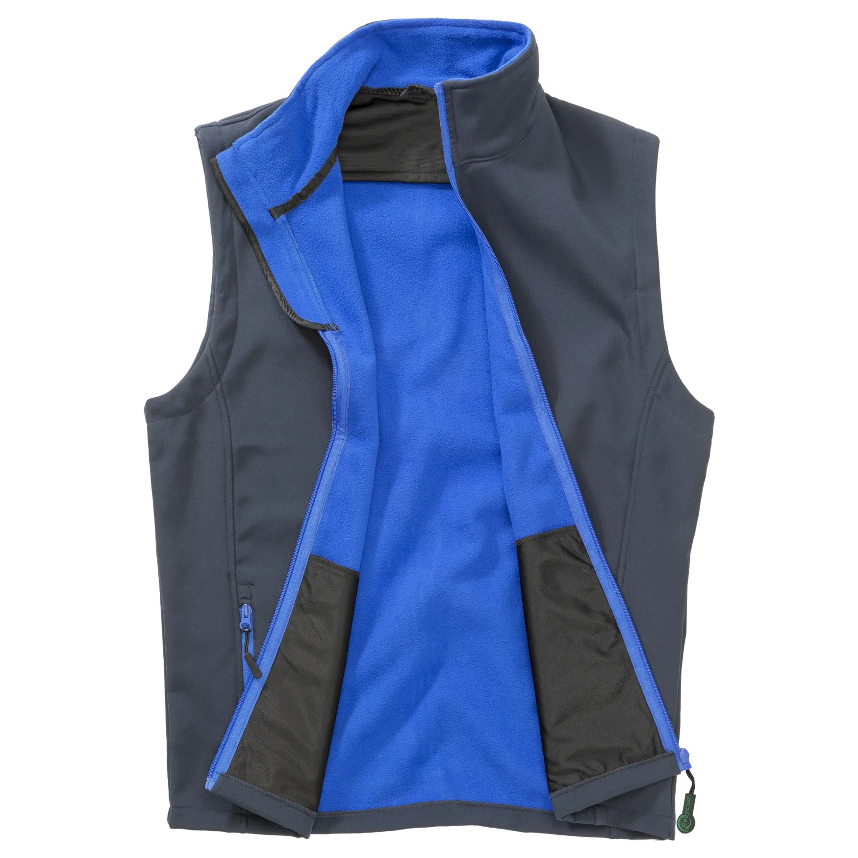 Softshell-bodywarmer herr är en ärmlös softshellväst, andningsbar och vindavvisande, med återvunnet microfleecefoder och ståkrage. Den har dragkedjeförsedda sidofickor och hakskydd.