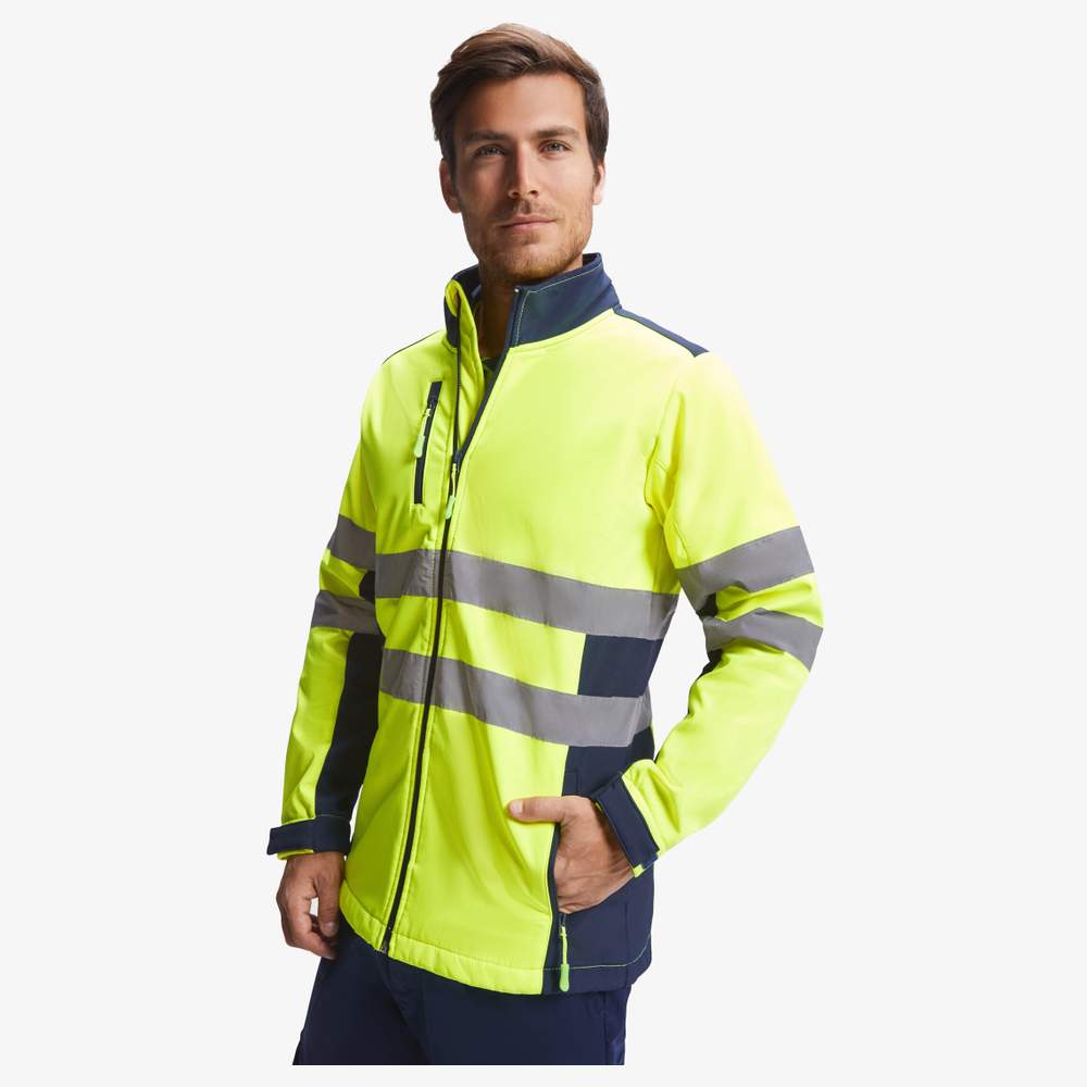 Säkerhetsjacka med hög synlighet Antares tillverkad i tvåfärgad softshell vattenresistenta, erbjuder termisk komfort tack vare sin mjuka insida. Den har två reflekterande remsor på bröstet och ärmarna för ökad synlighet. Stående krage och omvänd mittknappning ger extra skydd. Justerbara manschetter med velcro och elasticerad midja med glidlås möjliggör anpassning. Den har tre praktiska ytterfickor.