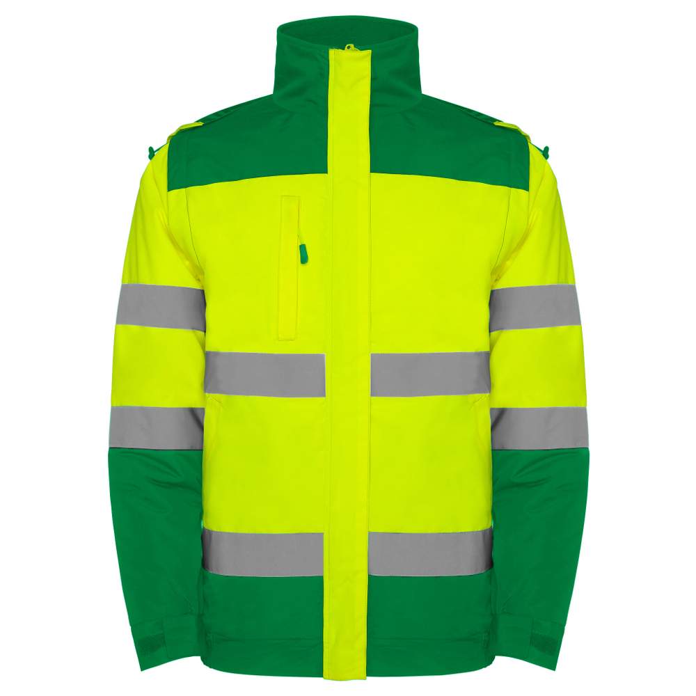Väst med hög synlighet i två färger Kombinerad väst med hög synlighet Kombinerad vatten- och vindbeständig. Två reflekterande band på kroppen och ärmarna Huva med flöjlinsats och justerbart med klämmor. Bröstficka med zipplås. Två framsidor facket i lätt lutning med enkel åtkomst. Bas med elastik. Ärmar justerbar med elastikband och klämremsa. Inre tillgång för märkning Avtagbara ärmar Certifiering CE enligt normerna EN ISO 13688:2013/A1:2021 EN ISO 20471:2013/A1:2017 Klass II Extérieur: waterproof polyester. Doublure: polyester.