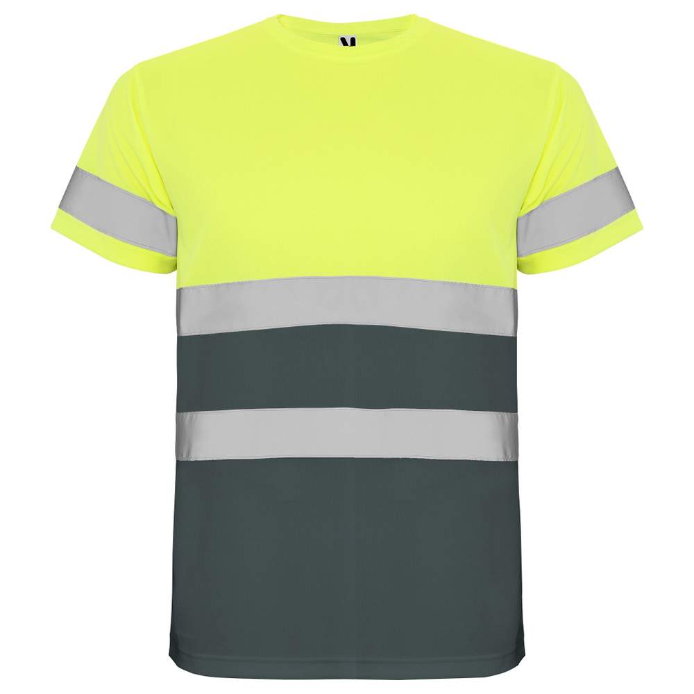 Högvisibilitets-T-shirts med korta ärmar. Rundhals med samma tyg och ett förstärkt inslagsband på insidan av halsen. Två horisontella reflekterande remsor på bröstet och en på ärmarna. CE-certifierat enligt standarderna: EN ISO 13688:2013/A1:2021, EN ISO 20471:2013/A1:2017. Klass I: 55221 - 55223 - 52221 - 23221. Klass II : 221 - 223. Teknisk väv. Hög synlighet. Andningsbar modell