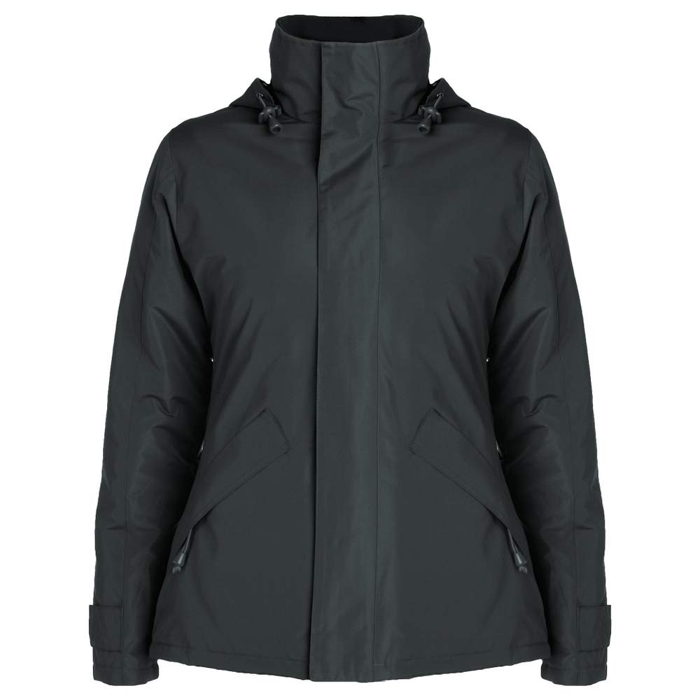 Parka med hög krava och ton-i-ton injicerad zip. Modellen har två yttre zippade fickor med glidare och överlapp samt två inre fickor som stängs med buntband. Huvan är vikbar och går att förvara i kragen med hjälp av ett buntband. Ärmarna är justerbara med buntband. Inuti är det foderat. Kvinnlig halvinsvept passform.