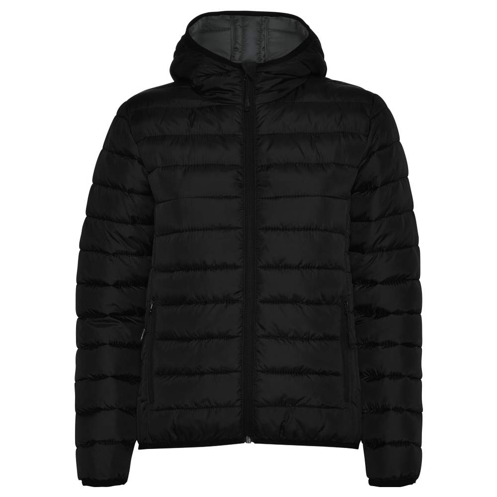 Damjacka matlad med fyllning som känns som fjädrar och fast huva. Omvänt blixtlås i samma ton som haka. Två främre fickor med blixtlås. Elastiskt band i samma ton i manschetter, botten och huvöppning. Inre fodring i kontrastfärg. Innehåller en transportväska. Lätt och plattbar klädesplagg. Tätt sittande skärning. Vattenresistent. Modell vindtätt.