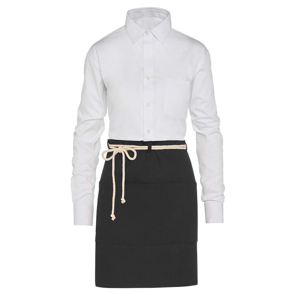Detta bistroförkläde kombinerar funktionalitet och estetik. Tillverkat i bomullstyg, försett med en naturlig snörning i midjan som passerar genom tygöglor, och en stor ficka med två fack. Lämpligt för professionellt bruk. Förkläde med naturligt utseende, i tunt sergertyg. Stor centralsydd ficka med två fack (40 x 20 cm). Mått: 70 x 50 cm. Sammansättning: 100% bomull.